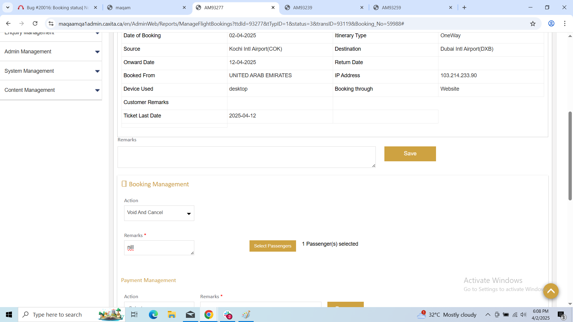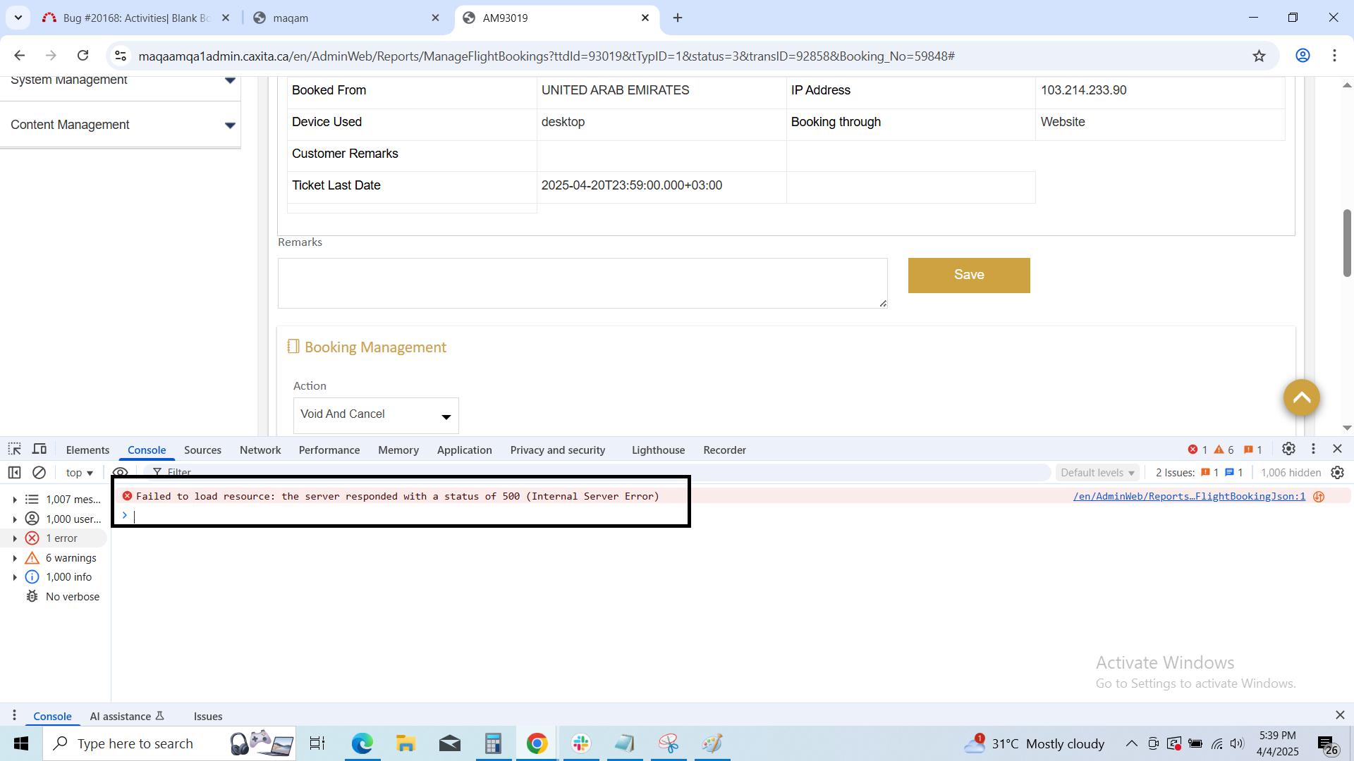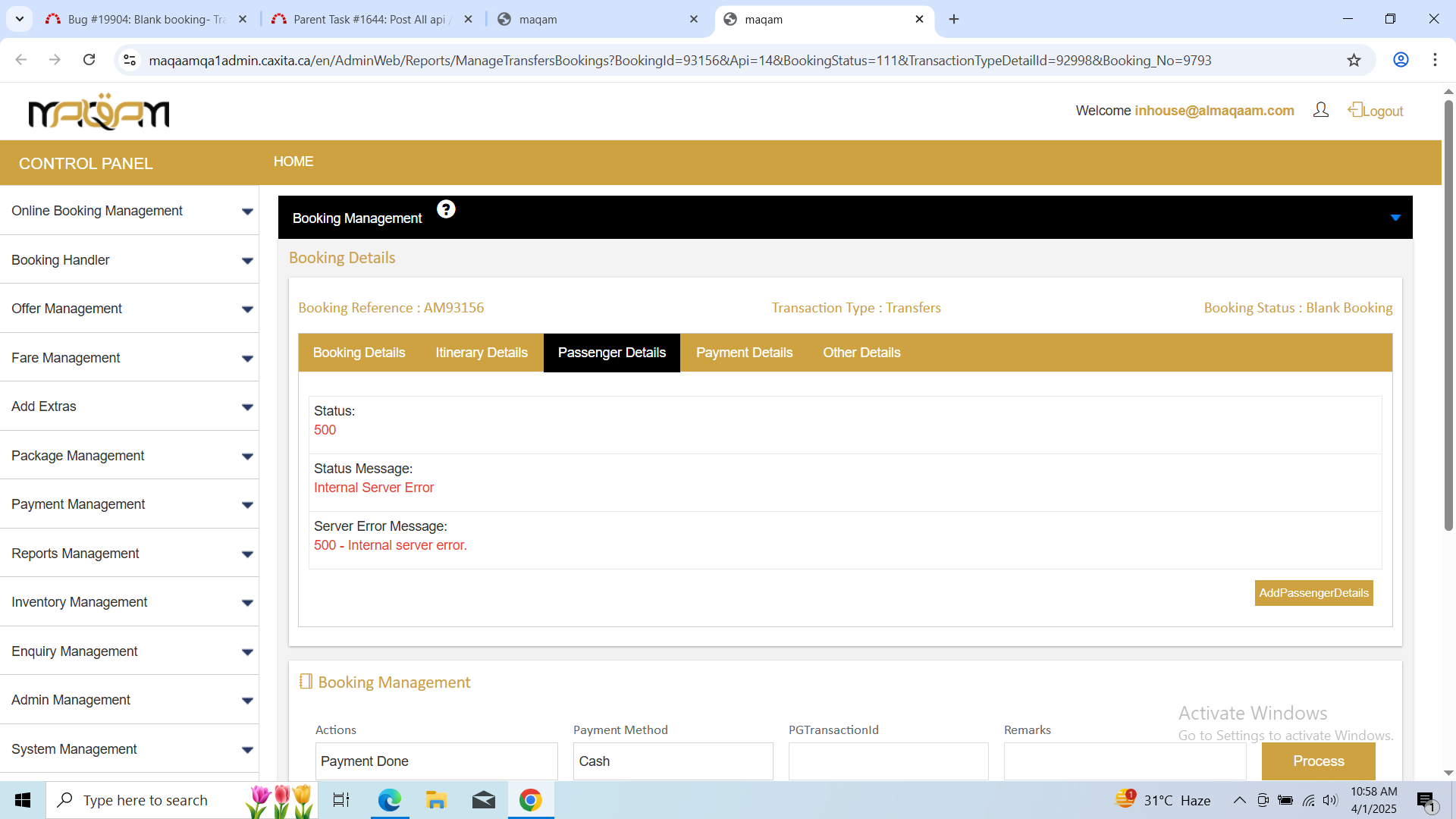 2)When clicking on the "Passenger Details" tab, a 500 status error is displayed.