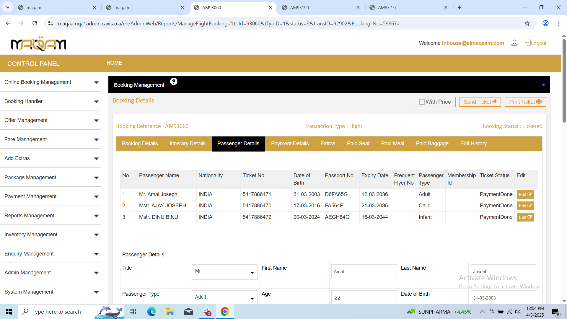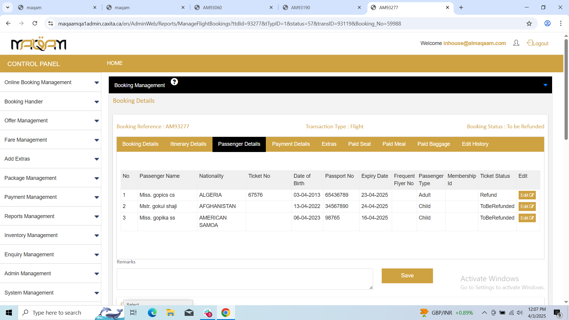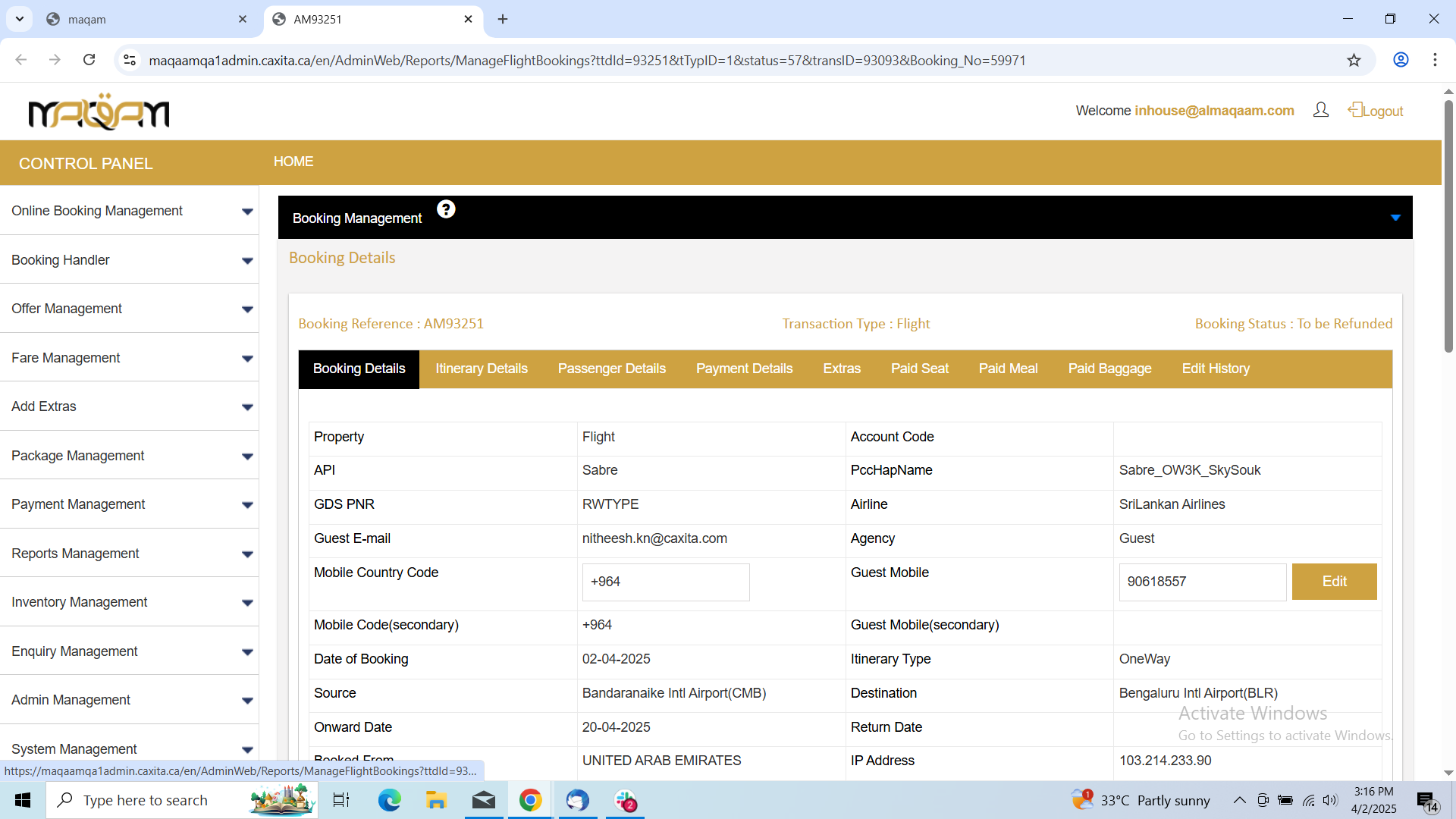 2)When clicking on the "Passenger Details" tab, a 500 status error is displayed.