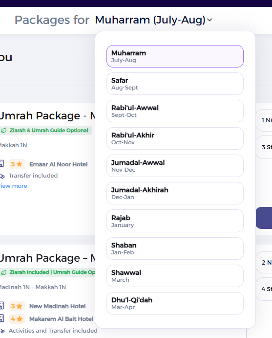 - Location-Based Distance Bar: Display one distance bar per location (e.g., Makkah & Madinah) instead of multiple bars for each package.