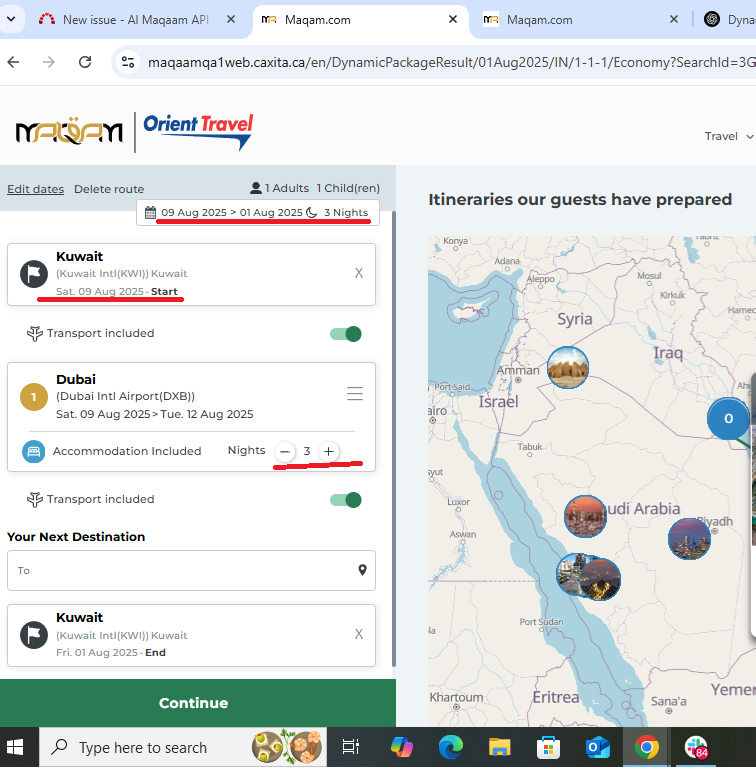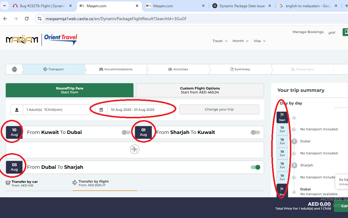 Scenario: After selecting the Dynamic Package and setting the Start date as August 01 and added one adult and one child and then did the search. After that, I entered Kuwait to Dubai, but when I add 2 days of accommodation in Dubai, the Start date changes automatically.