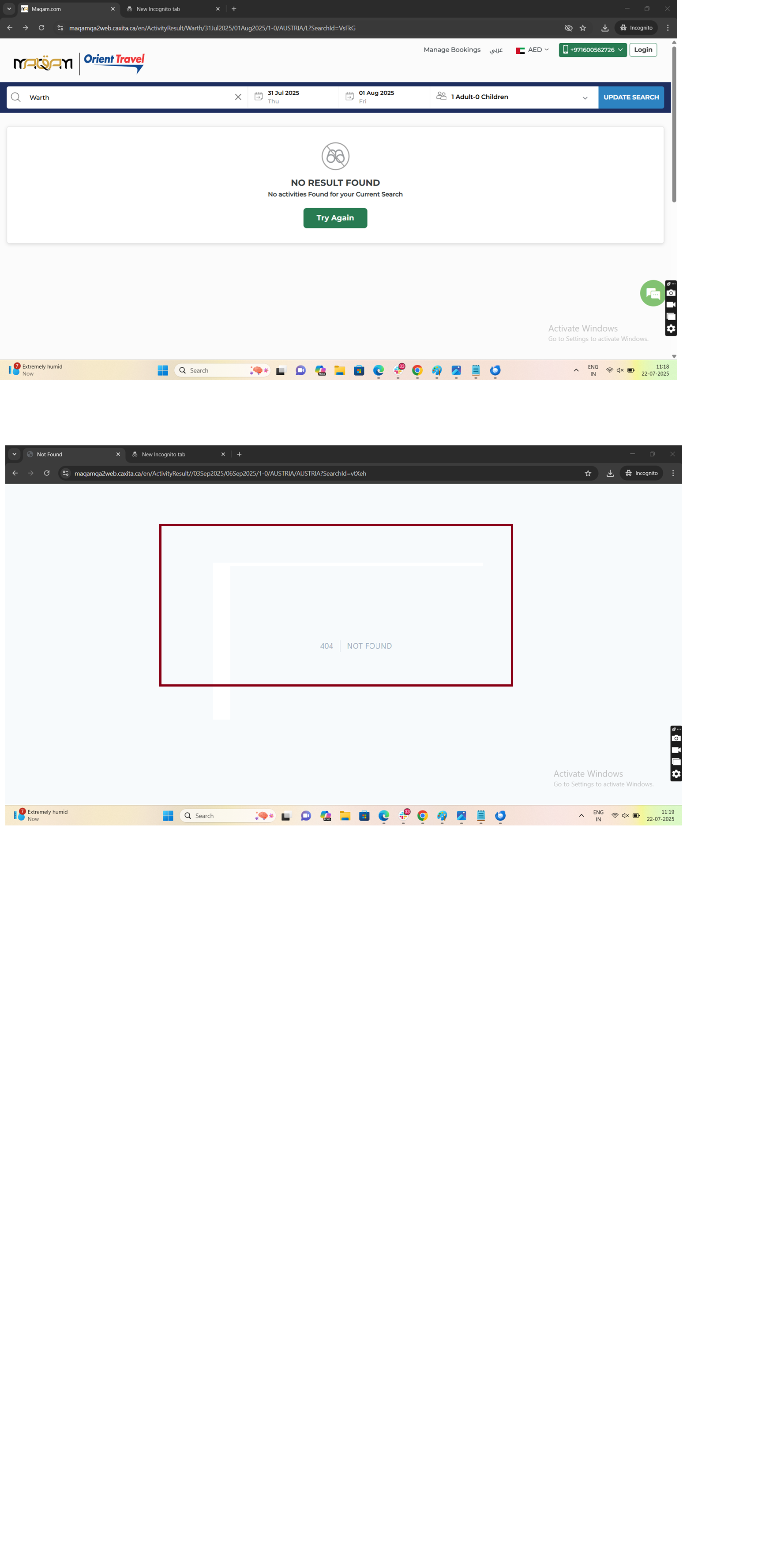 Done activity search for the below scenario then no result page is displayed . Then using modify search I changed the date and tried again then 404 error page is displaying.please fix it