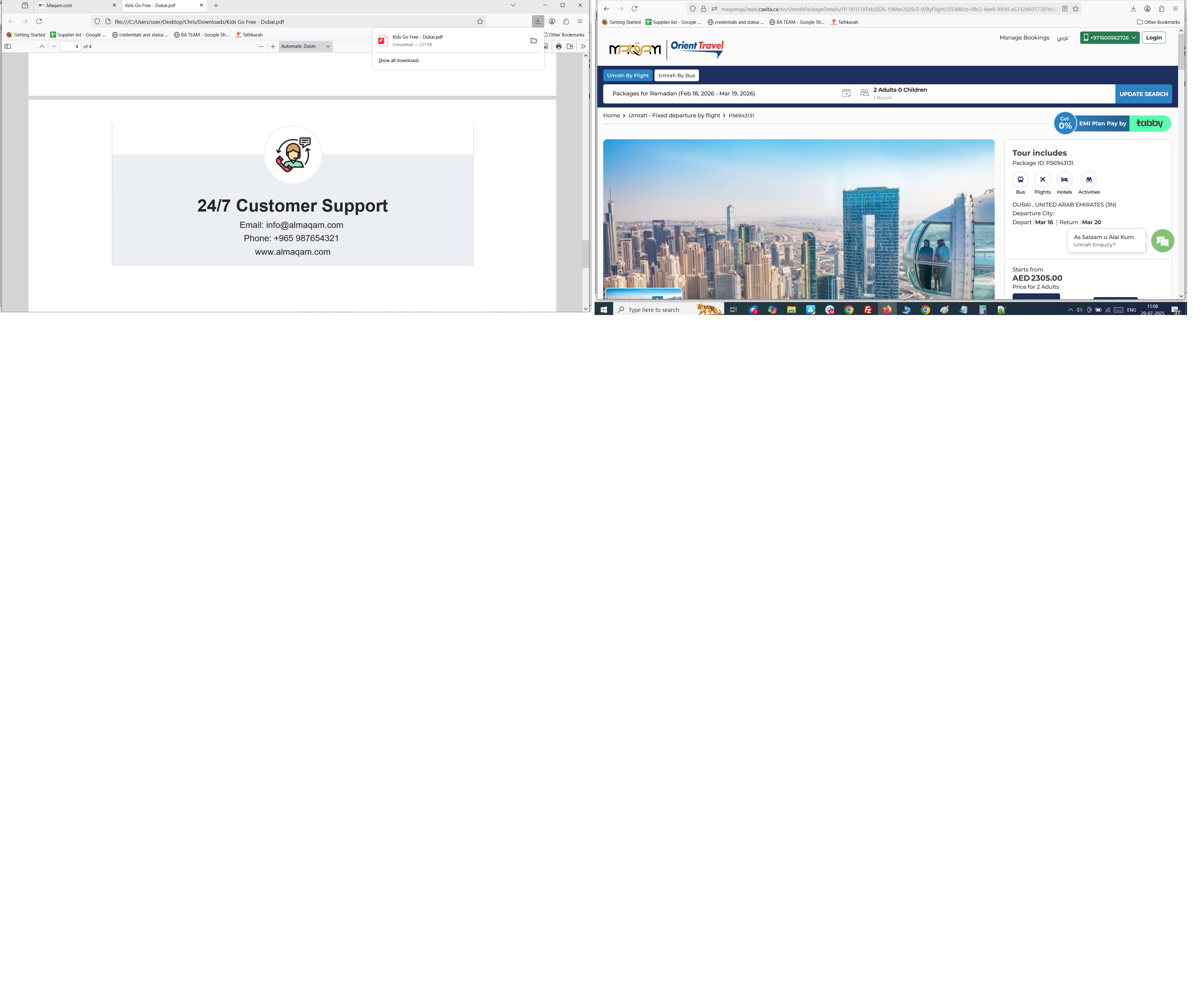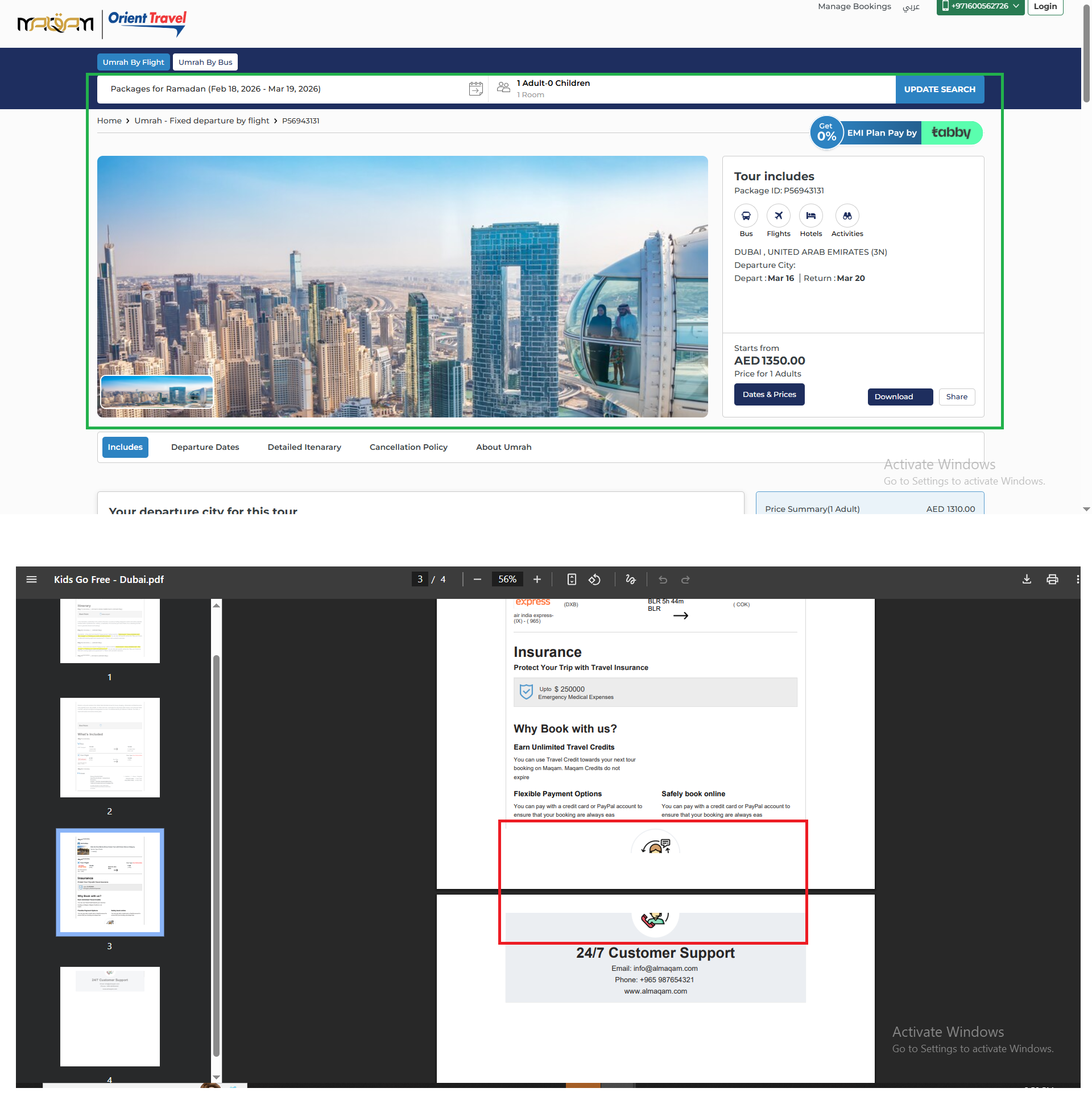 Searched a fixed package "Packages for Ramadan (Feb 18, 2026 - Mar 19, 2026)" with 1A PAX, from package result selected a package "P56943131" tried to download the brochure from the details page. Inside the downloaded brochure PDF, the customer support logo is not getting properly. Please fix this issue attaching screen shot for reference.