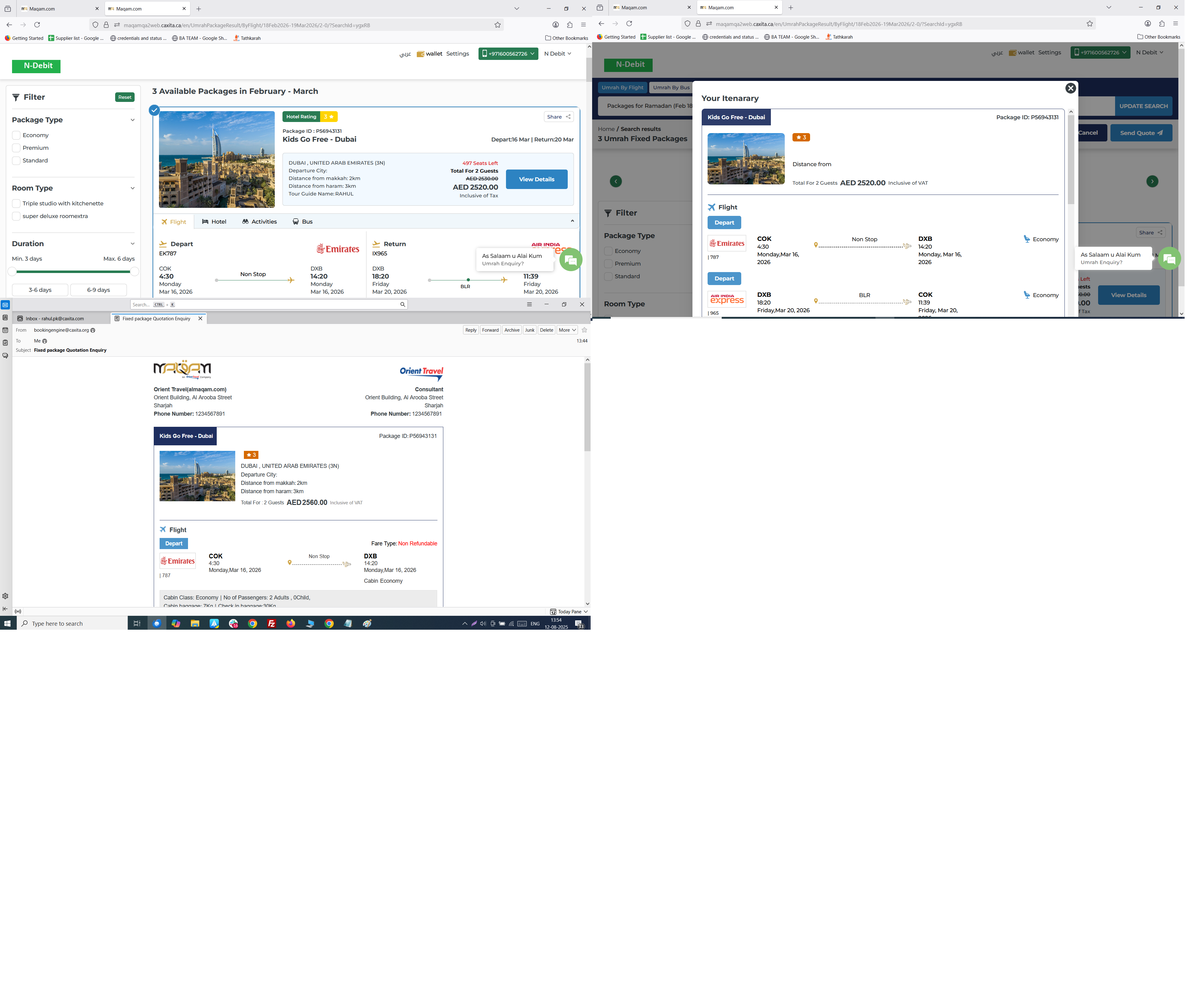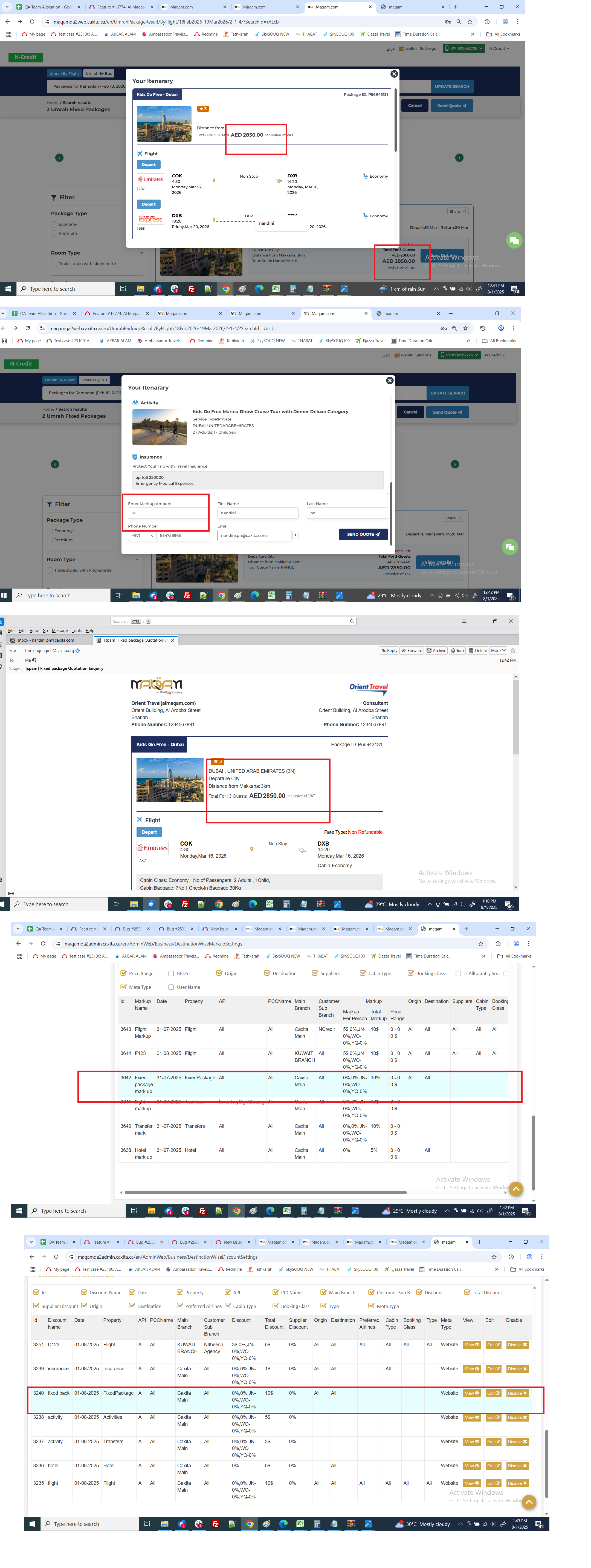 Search a fixed package through agency and proceed to package result page . Select the one fixed package and sent Quotation mail to the customer mail. Mark up 10% and discount 10AED is added for agency. In room details page click on sent mail the fixed package quotation details is displayed. Here enter instant mark up 30 AED and quotation sent to the customer mail id.