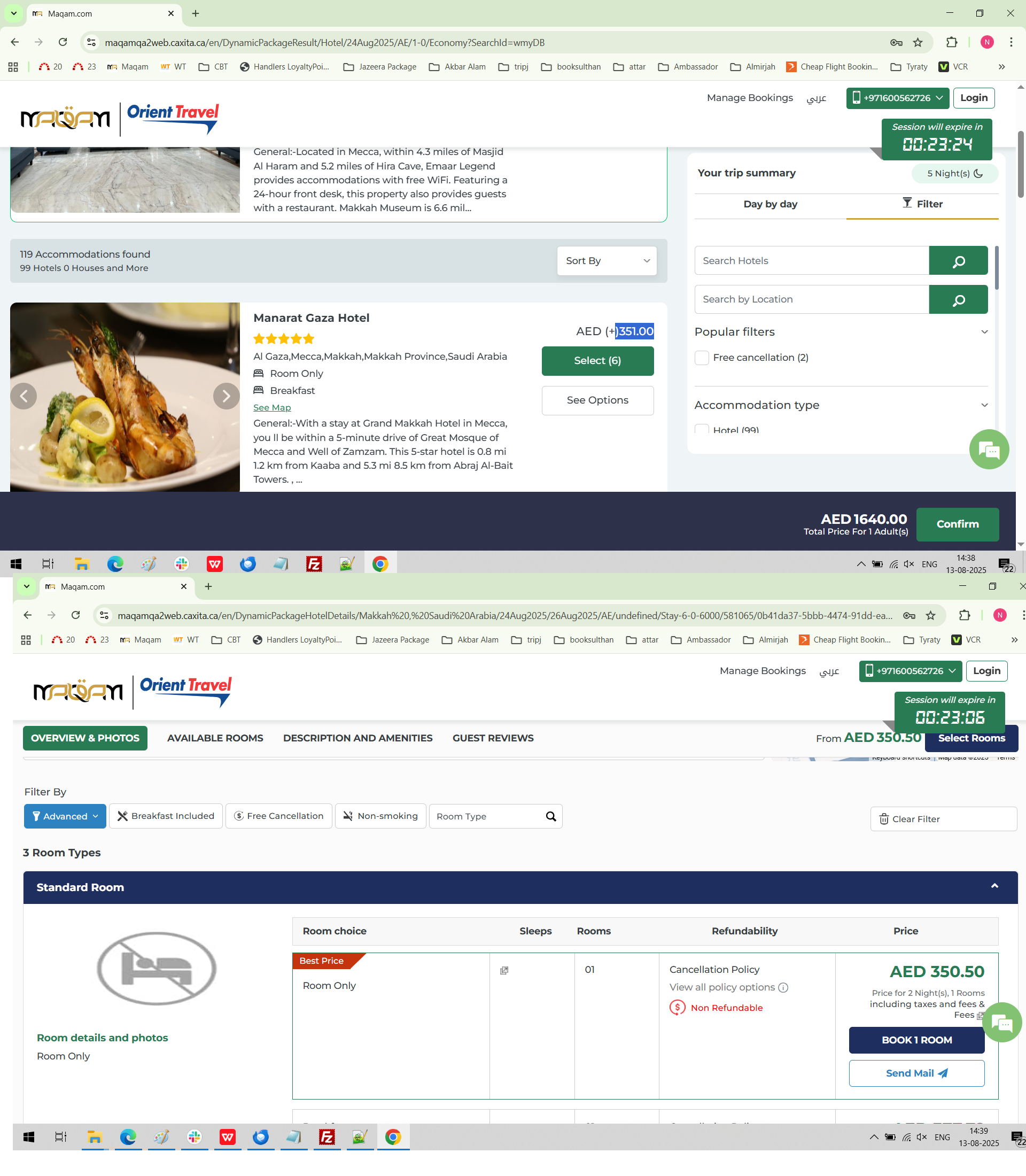 Search any hotel and proceed upto flight result page / see more accommodation page , hotel result displayed with price + 351 AED, it's wrong existing selected hotel price is 135 AED. Please show actual +/- price