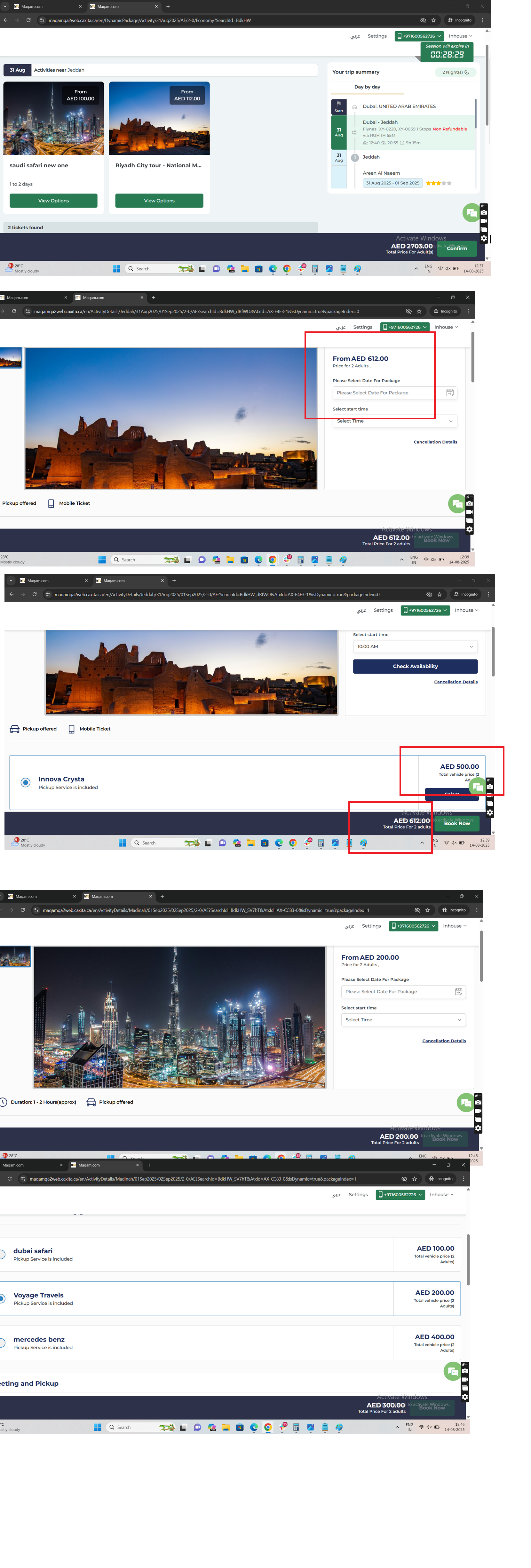 Done dynamic package search upto activity details page. At this time I selected the vehicle amount is not getting added with the activity price.please fix it.