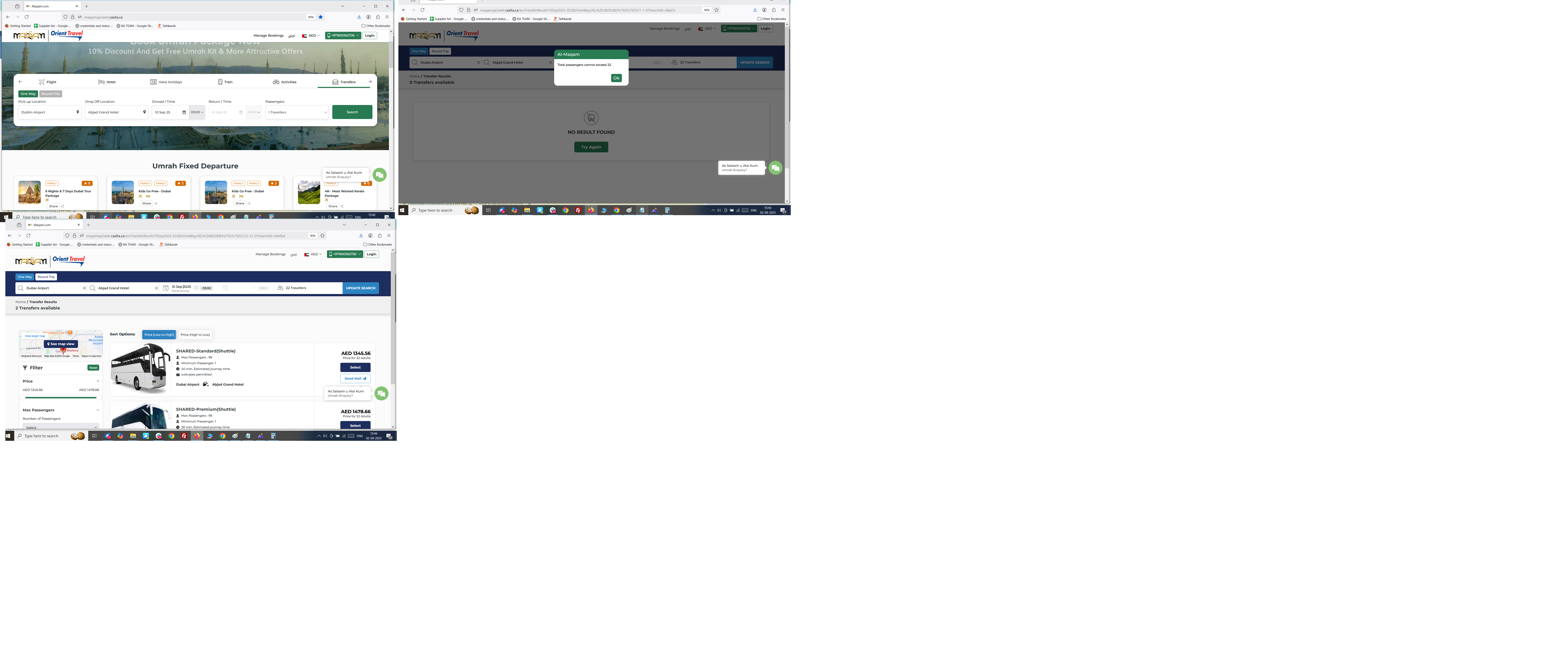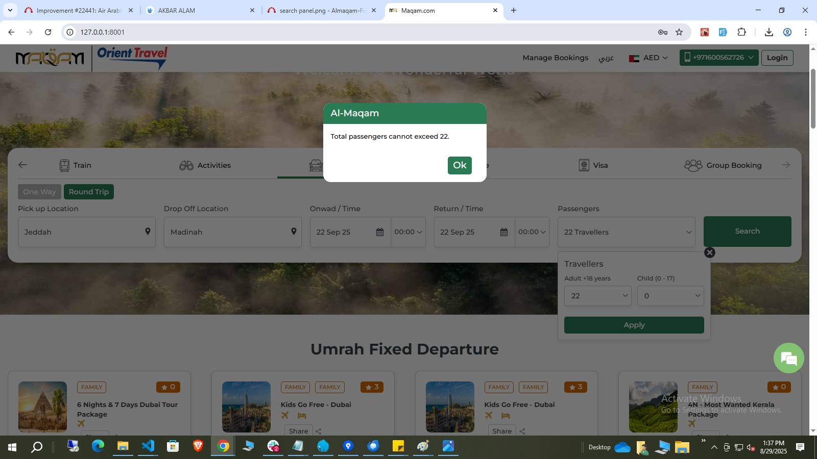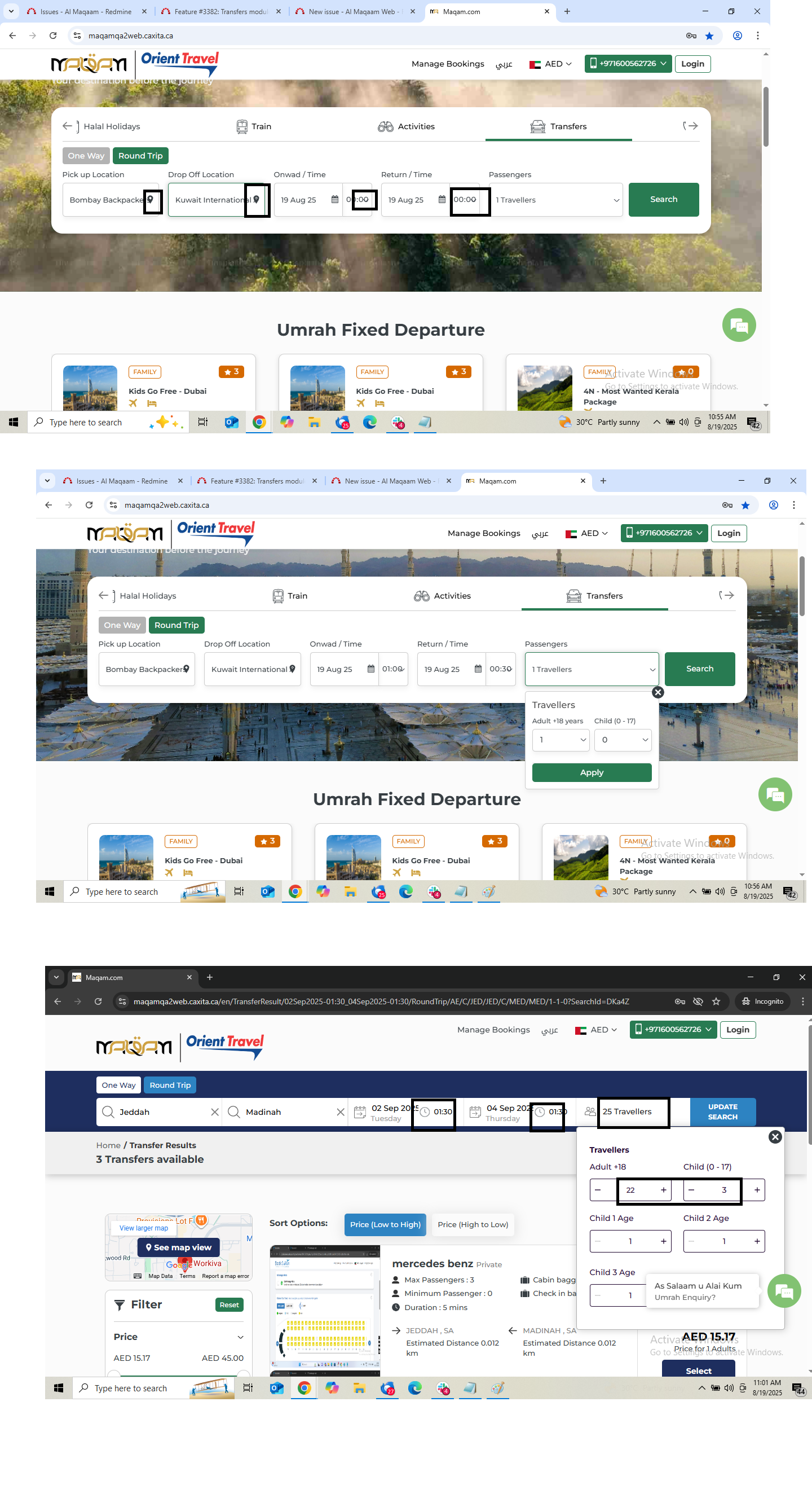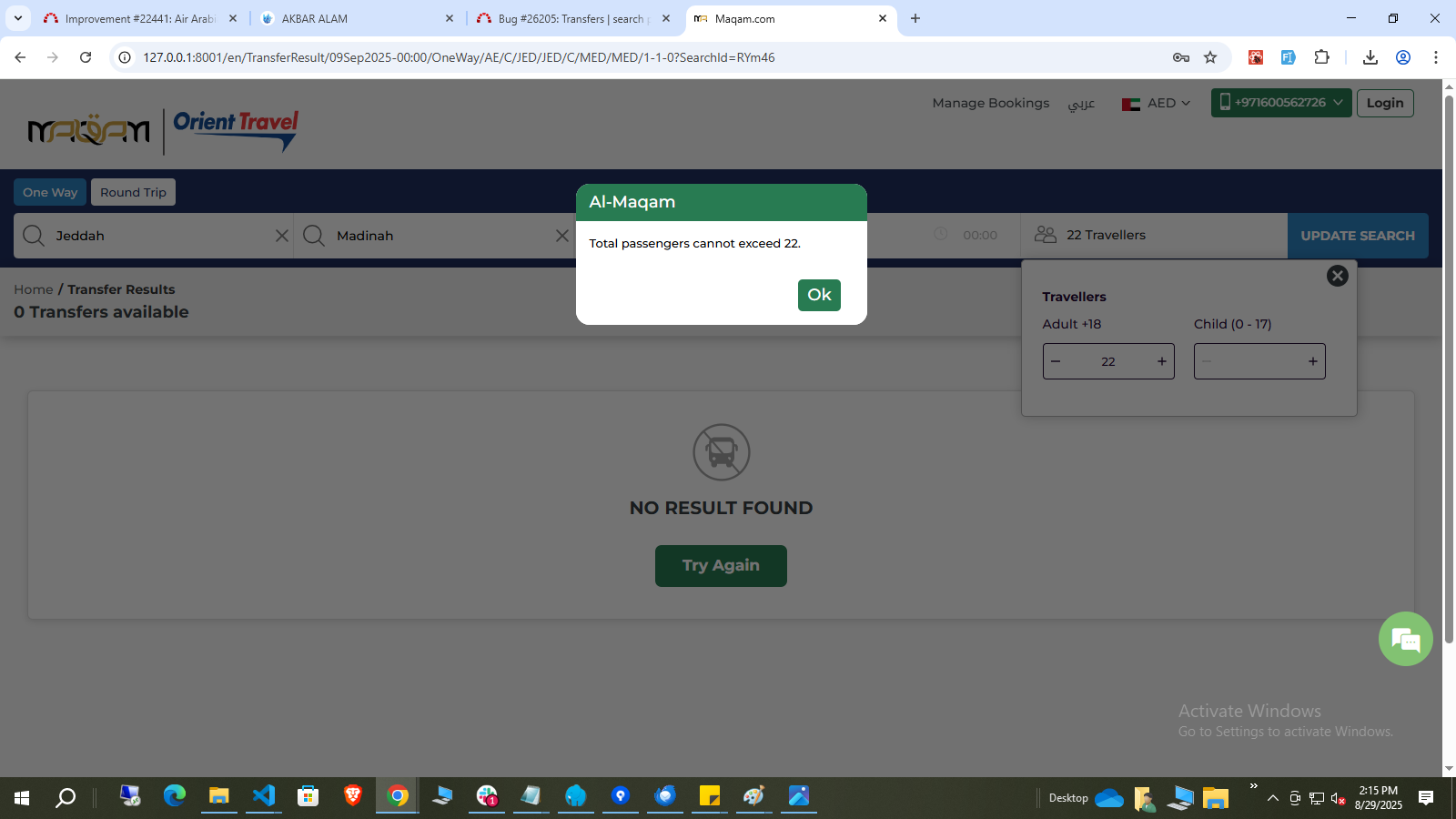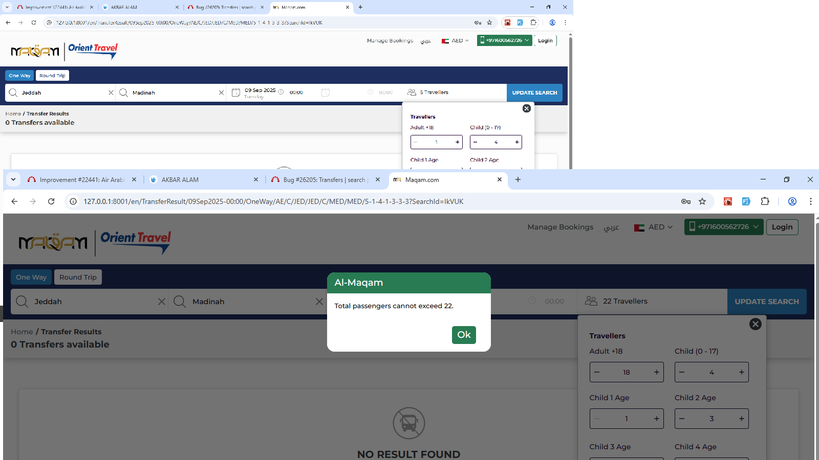 3. In the Add Traveller section, the system is supposed to allow only up to 22 passengers (both adults and children combined). However, I’m able to add more than 22 passengers. If 22 adults are selected, the child selection should be restricted, and a validation popup should appear.