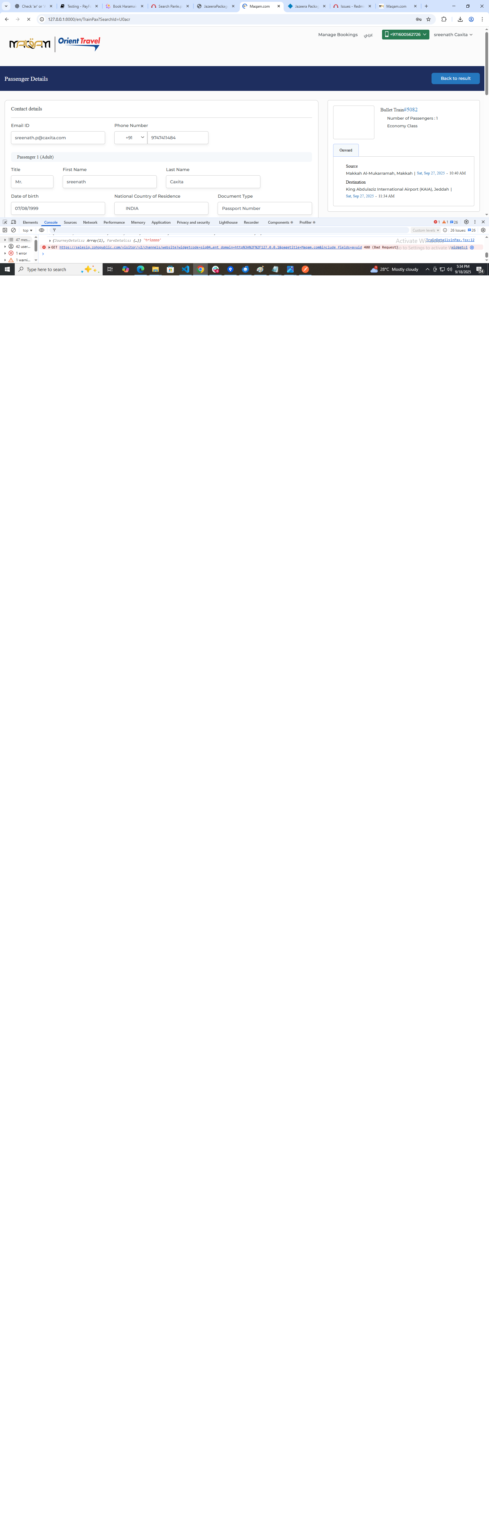 4. On Pax page do login after login success passenger details not auto filled. Result required in this scenario the login user all details should be auto filled same as added in profile section (nitheesh.kn@caxita.com / Caxit@1)-not fixed as of now blank page displaying when login from pax --fixed-- screenshot attached