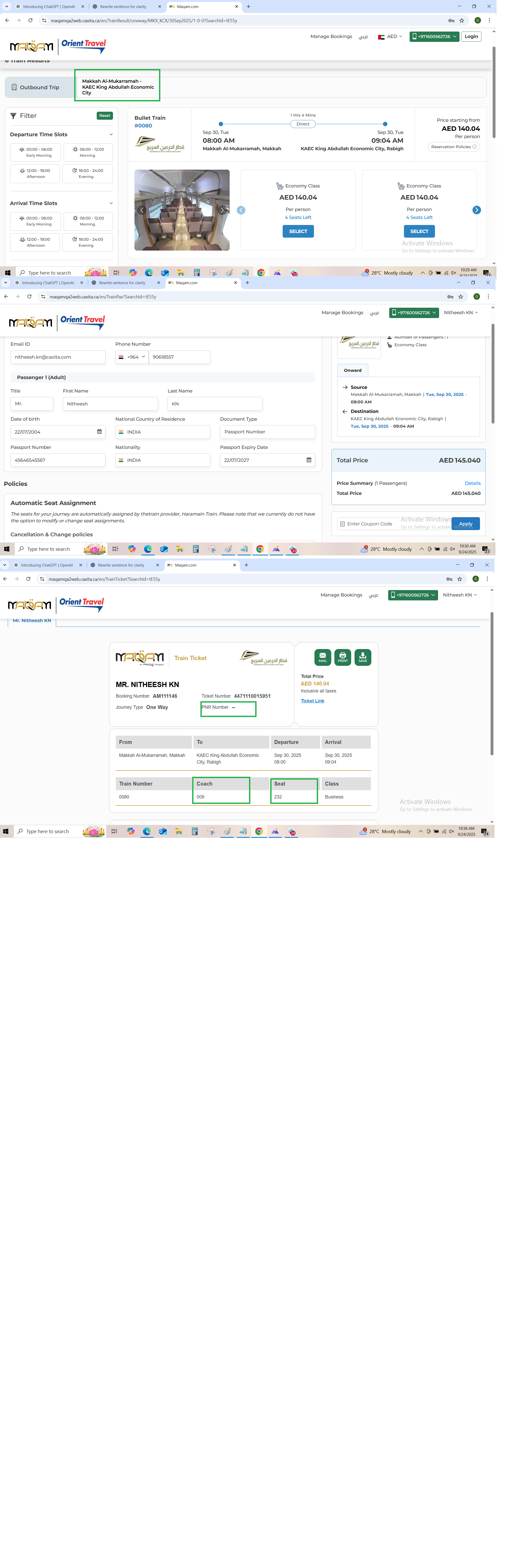 7. On Ticket, Ticket number , coach , seat displayed as Pending / N/A - In response it getting - please show the actual details