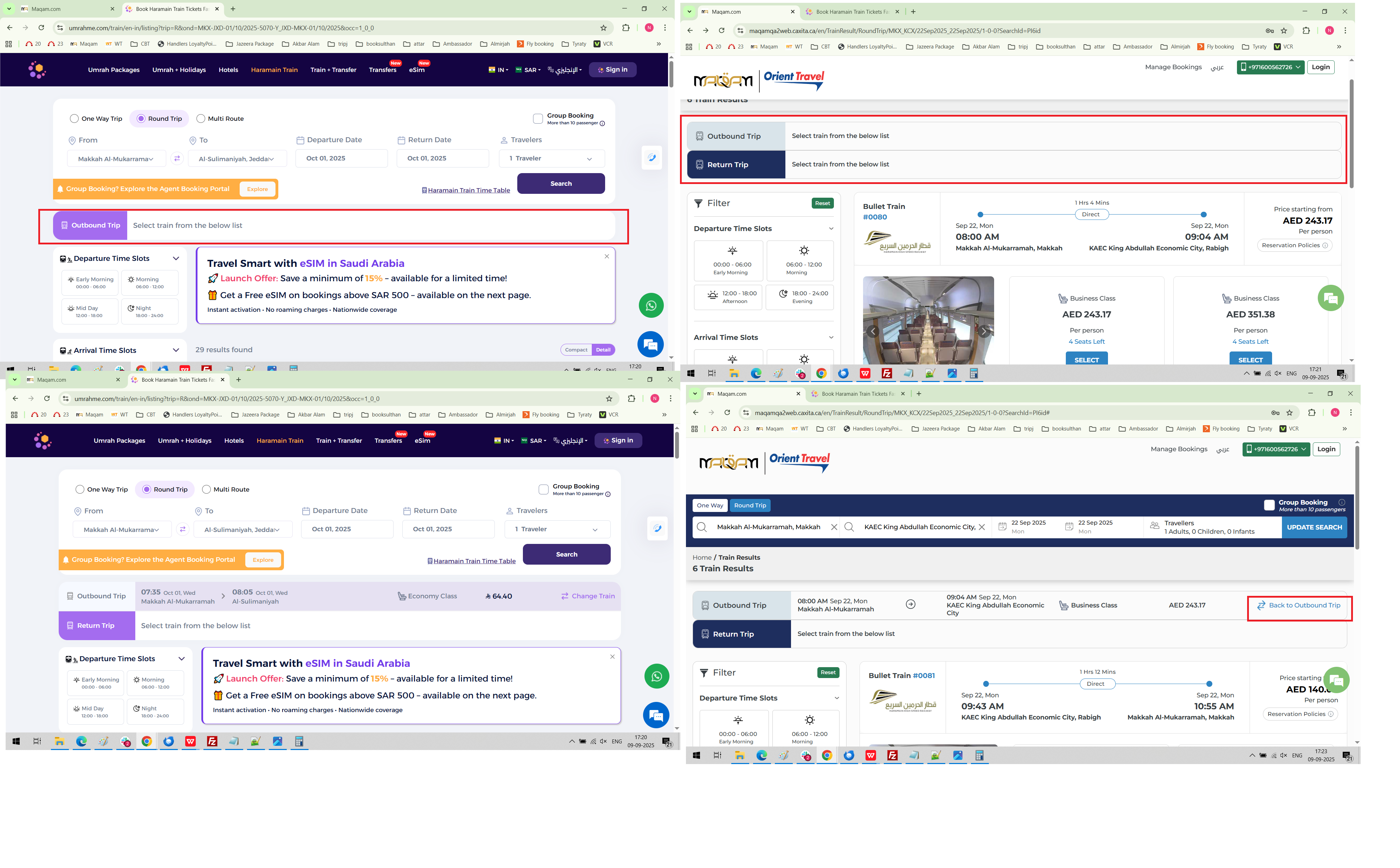 Search round trip train - On result page now Outbound Trip & Return trip option displayed by default - Result required in this scenario by default Outbound option only required initially if selected outbound show Return Trip section also - like https://www.umrahme.com/---fixed