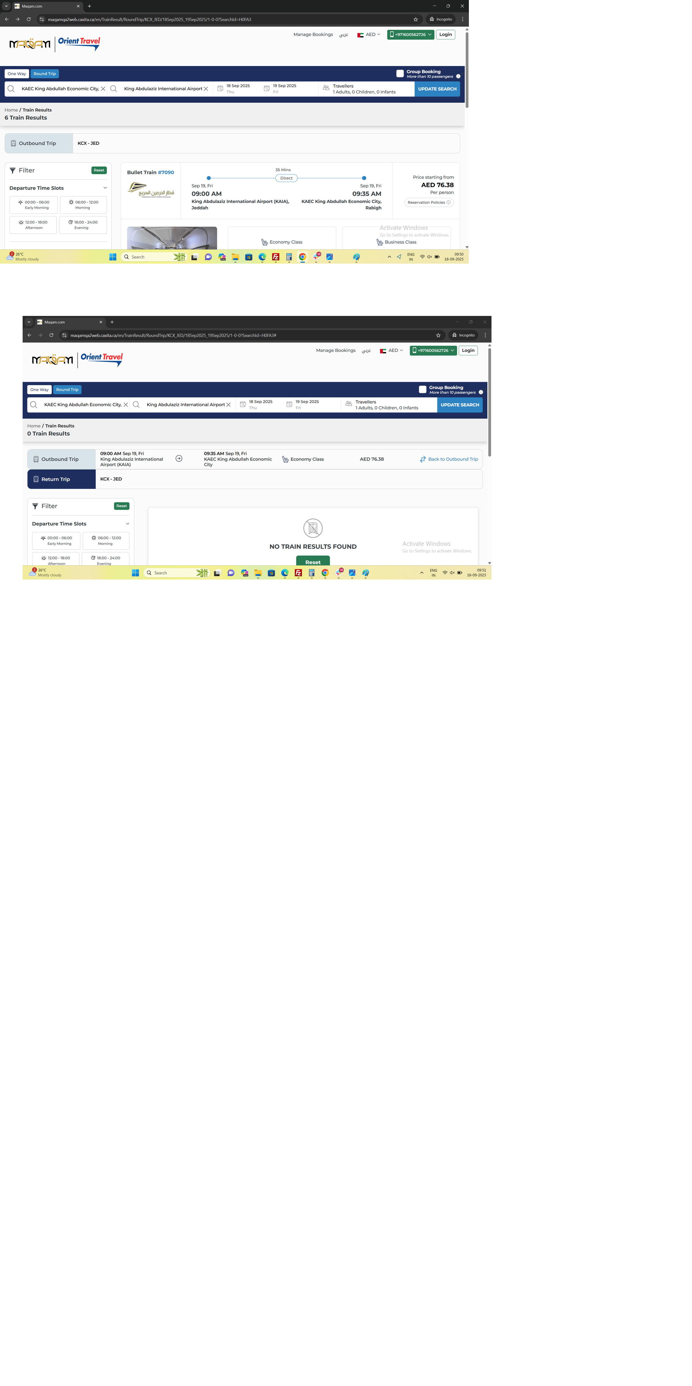 Search round trip train - On result page now Outbound Trip & Return trip option displayed by default - Result required in this scenario by default Outbound option only required initially if selected outbound show Return Trip section also - like https://www.umrahme.com/