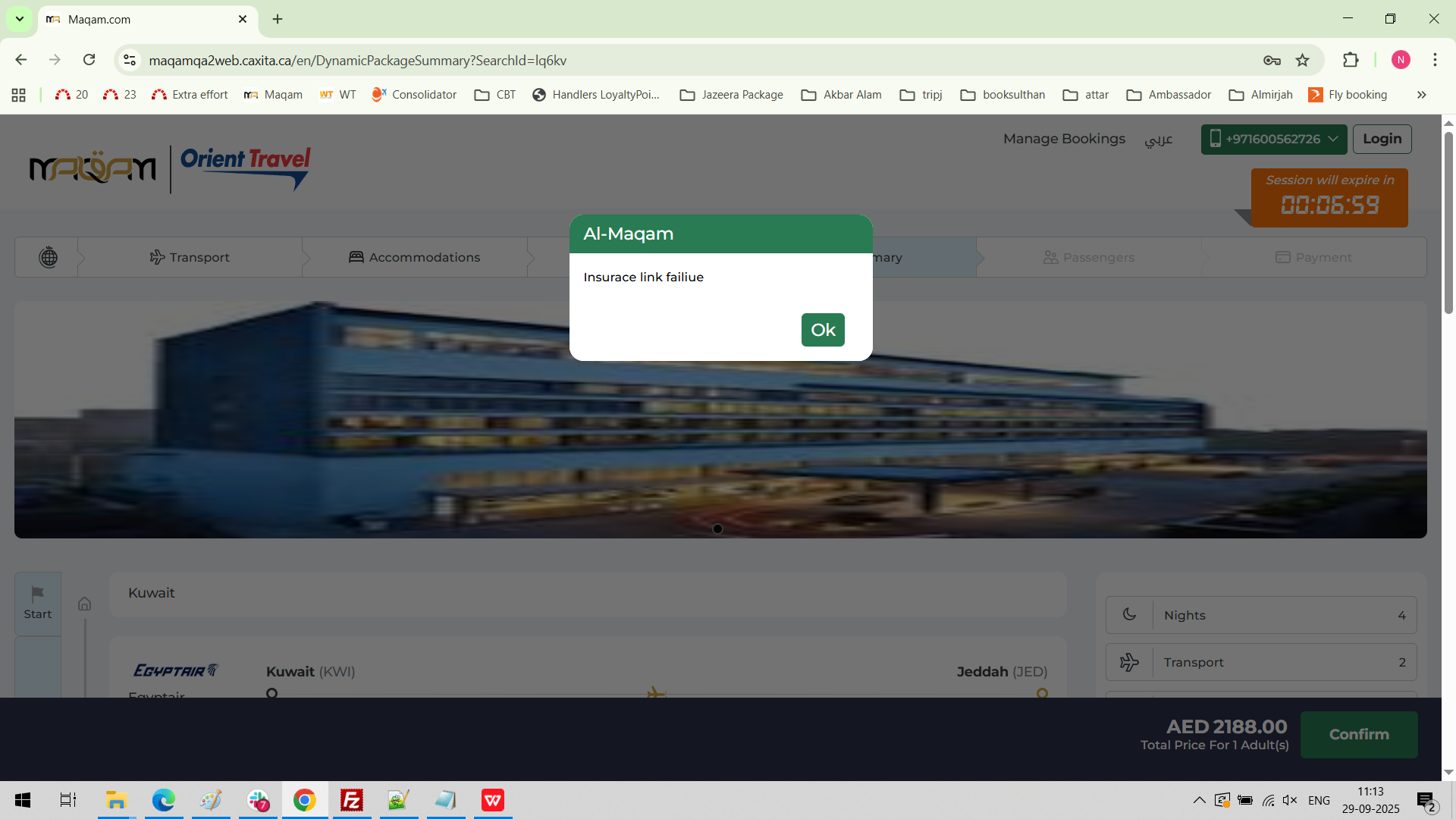Searched Kuwait - Makkah - Madinah - Kuwait and proceed to summary page from flight result page, while reached summary page Insurace link failure message displayed. Please fix the issue