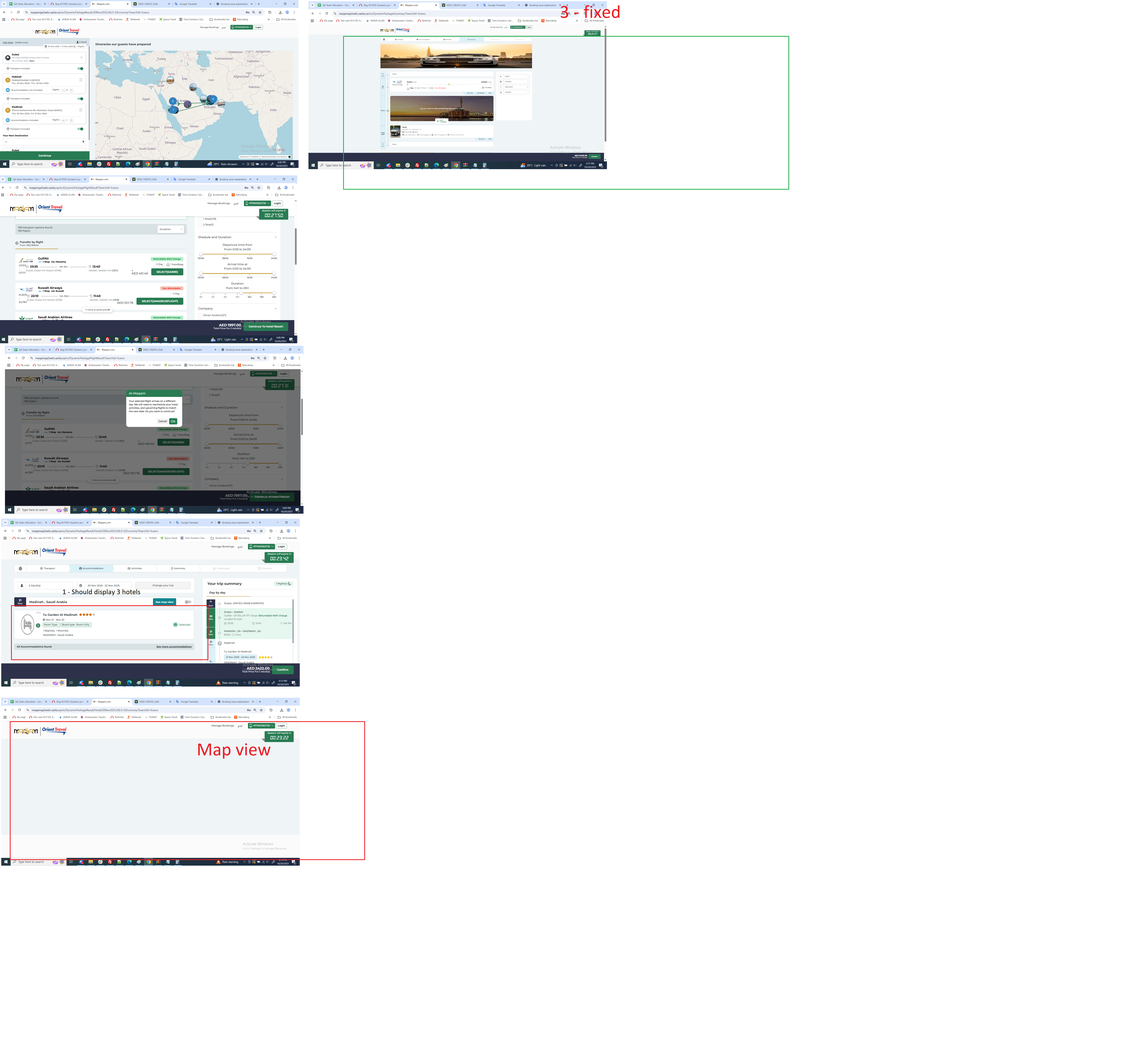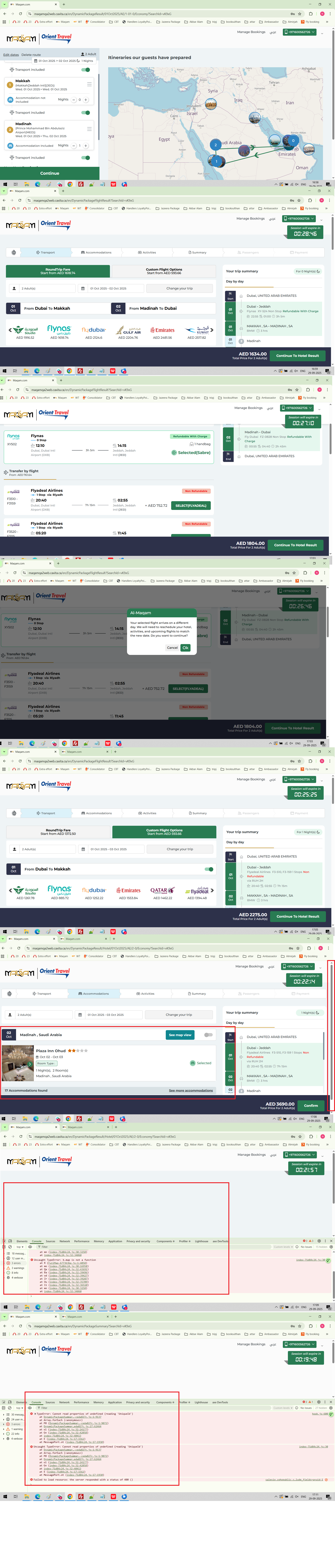 Search Dubai - Makkaha - Madinah - Dubai with below scenario or any scenario with hotel available for any 1 segment only and proceed up-to flight result page and selected next day arrival flight and proceed to hotel result page. Below issues founded