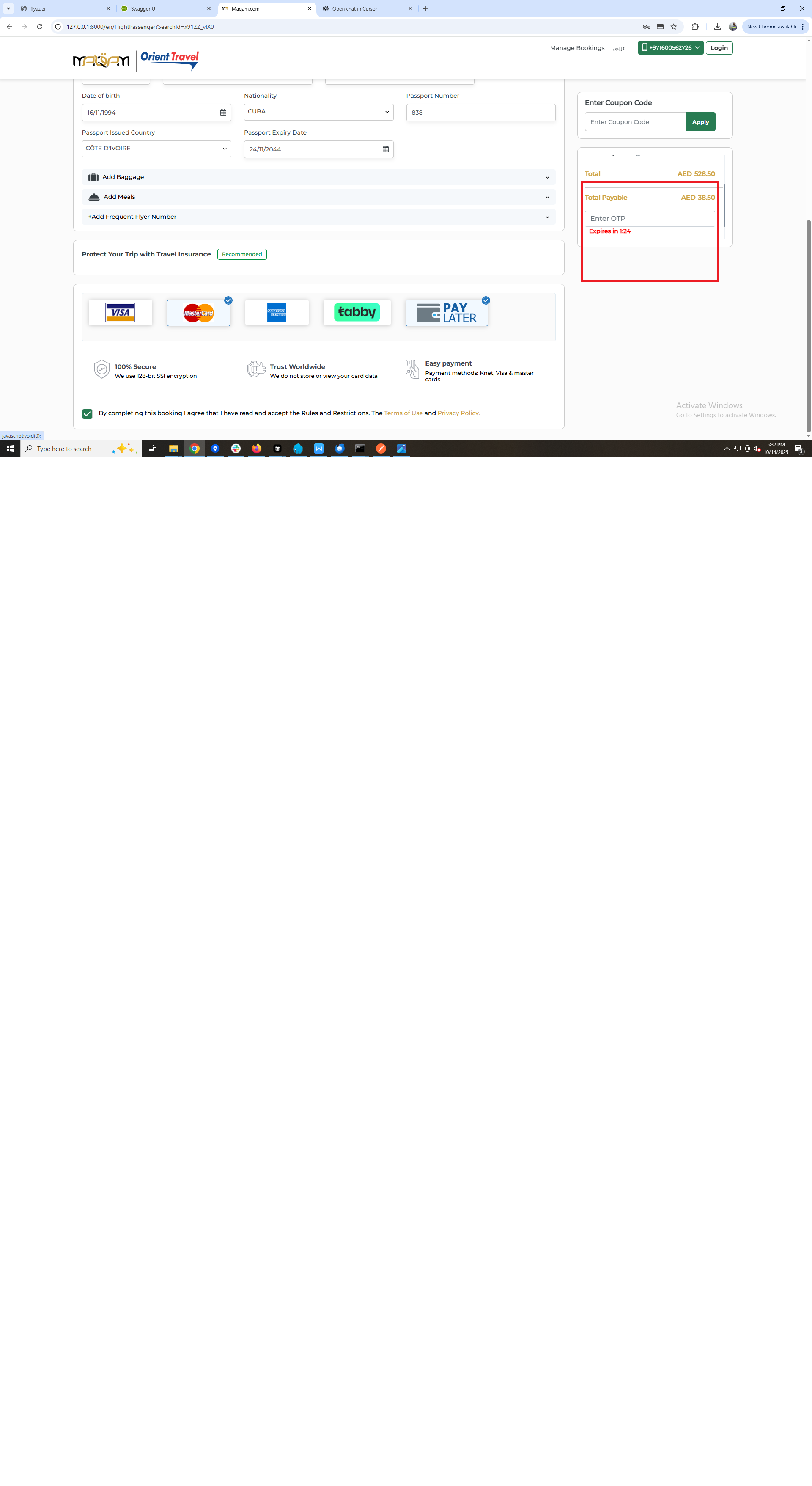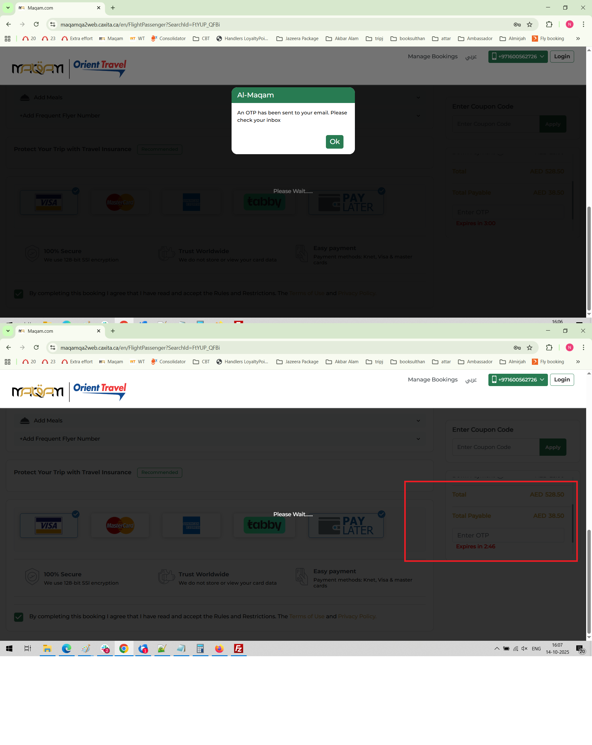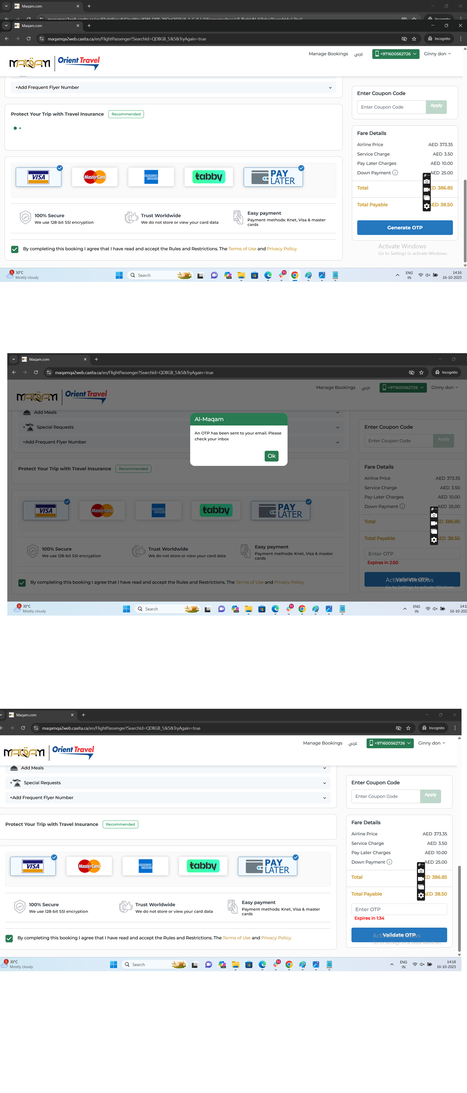 Search KWI - DXB and select Emirates / any airline and proceed to pax and sent OTP, otp sent success popup displayed, after click ok button the popup background black color (overlay background) not removed - please fix the issue