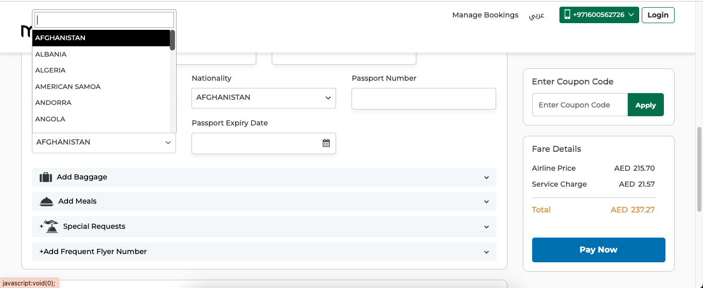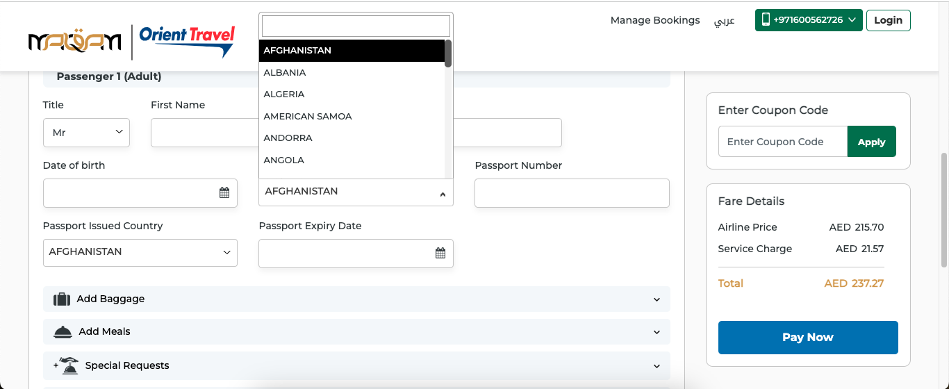 The "Nationality" and "Passport Issued Country" dropdowns overlay the top banner when scrolling on the passenger details page.