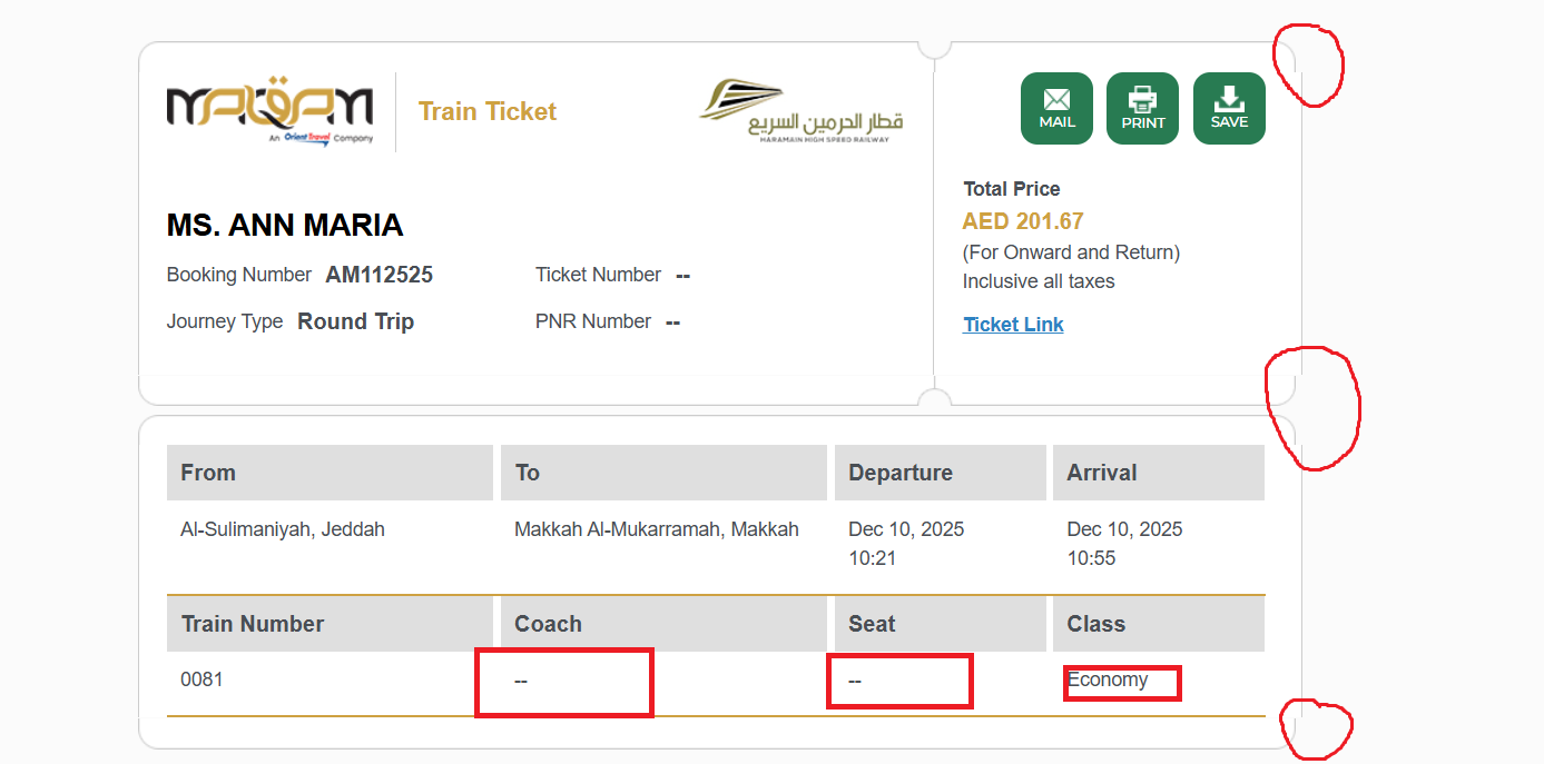 Additionally, the ticket is missing the QR code, seat number, and coach details.