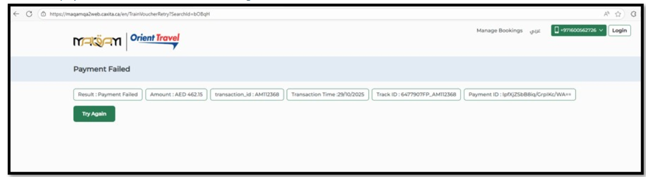 3.Payment failed page is showing transaction/track/payment IDs to users — these should be removed. Also need confirmation on where the payment failure notification is being sent.