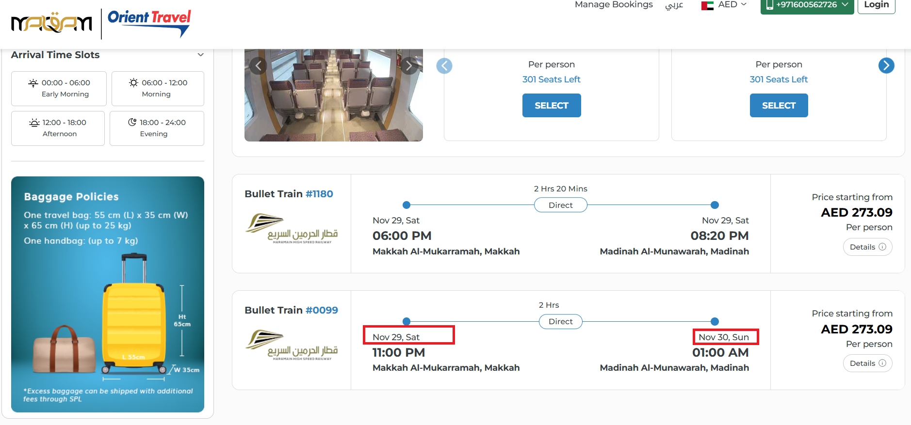 4.Train date-change not highlighted — selecting the 11:00 PM Makkah → Madinah train on Nov 29 arrives on Nov 30, but it does not clearly indicate the next-day arrival. Highlight date changes to avoid user confusion.