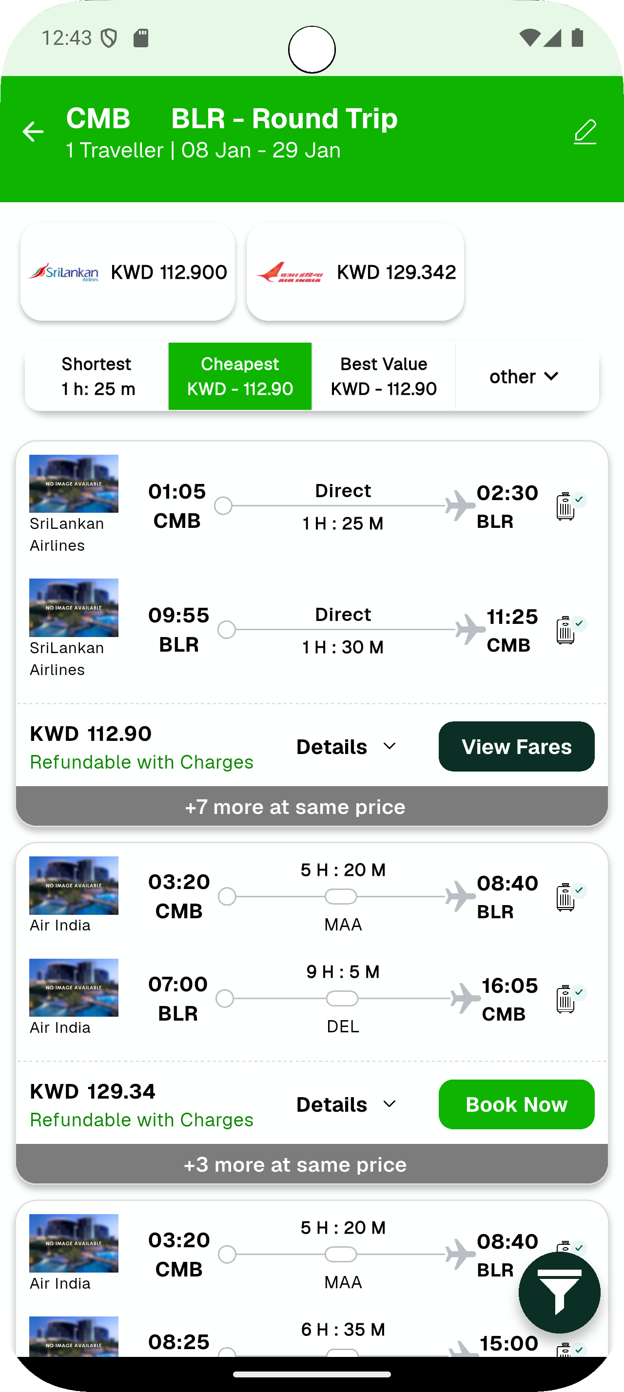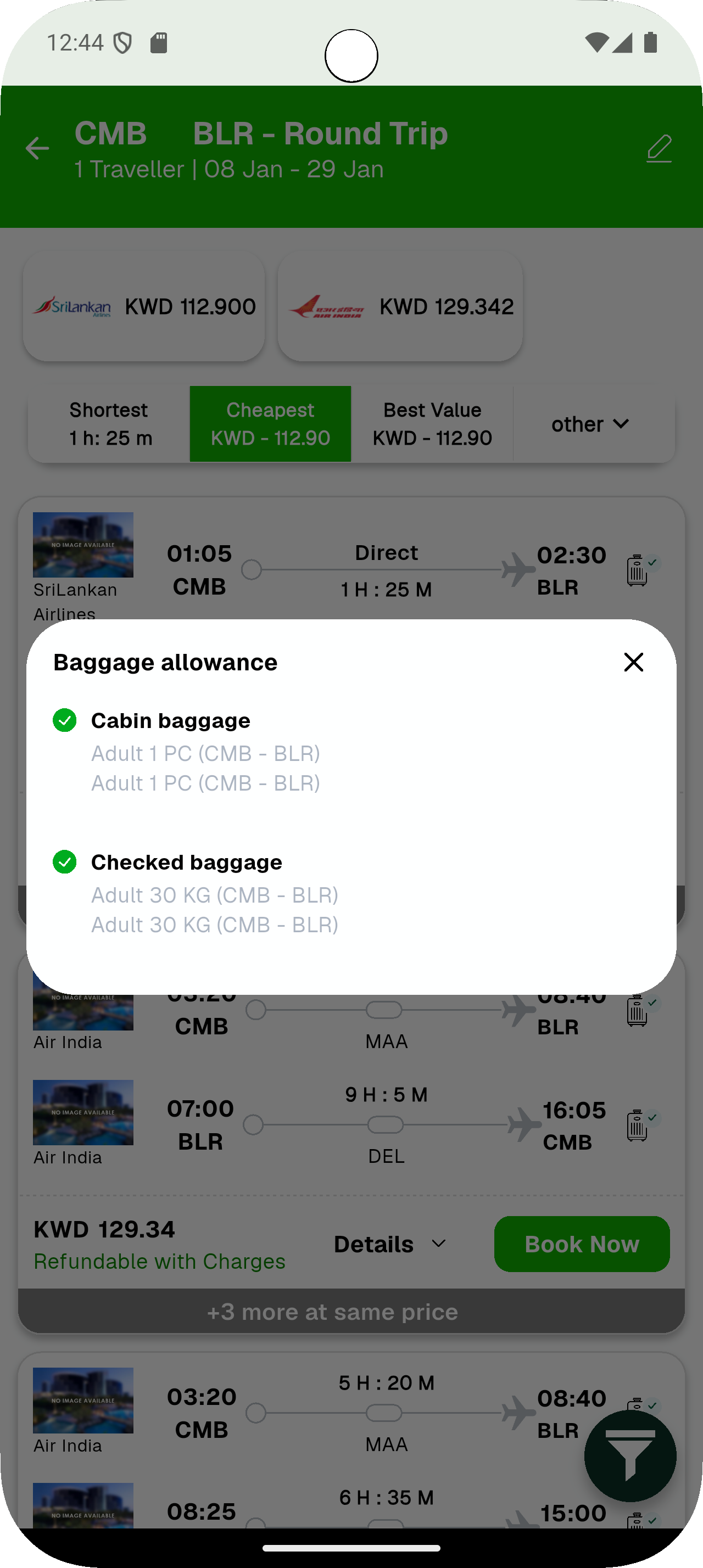 Today I changed the Flight Result UI, More Result screen, Branded Fare screen, Baggage popup, and filtering. Tomorrow I’ll work on sorting.