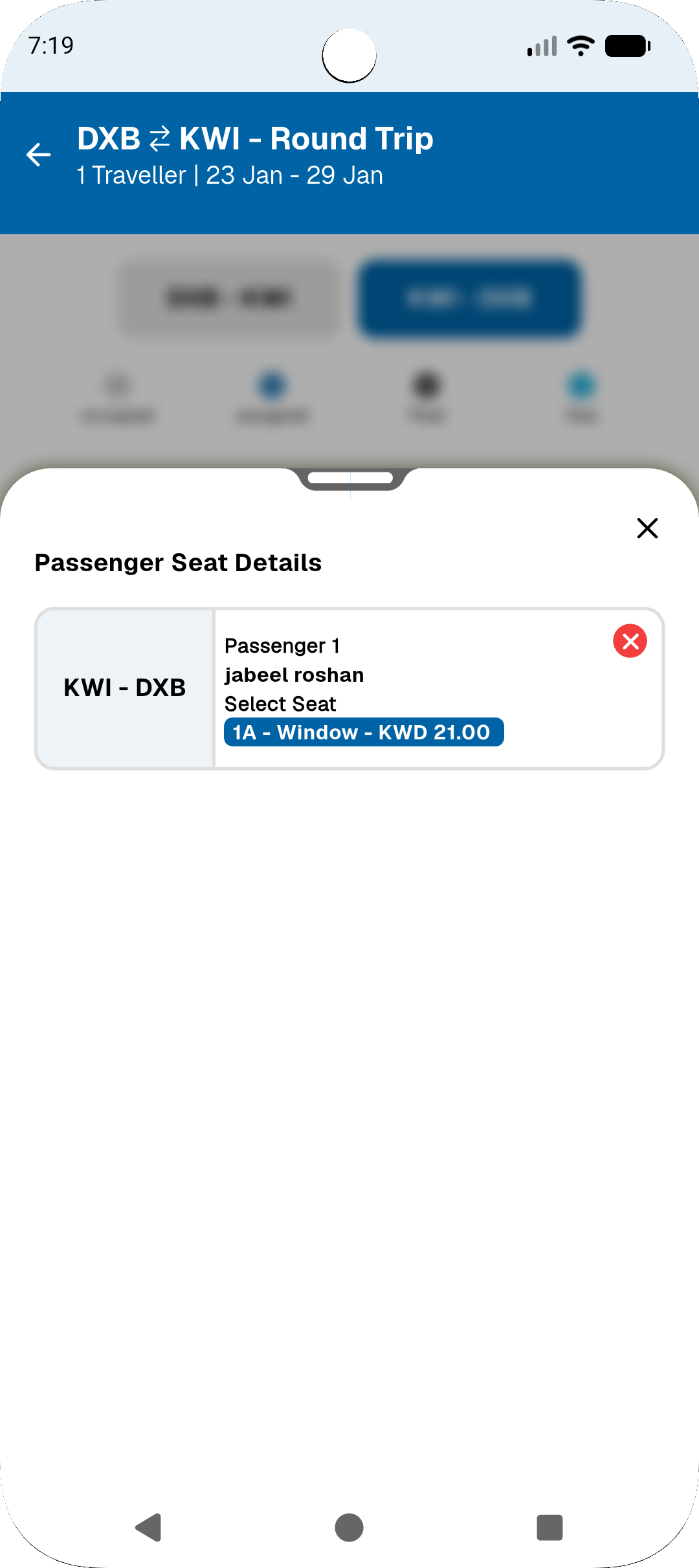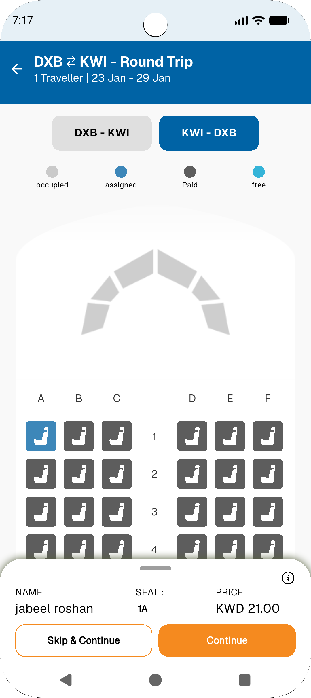 Today, I completed the seat selection integration in the flight module according to the Figma design. Users can now choose a paid seat or opt to skip the selection and continue with the booking process. The User, can view the details of their selected seat in a bottom sheet.