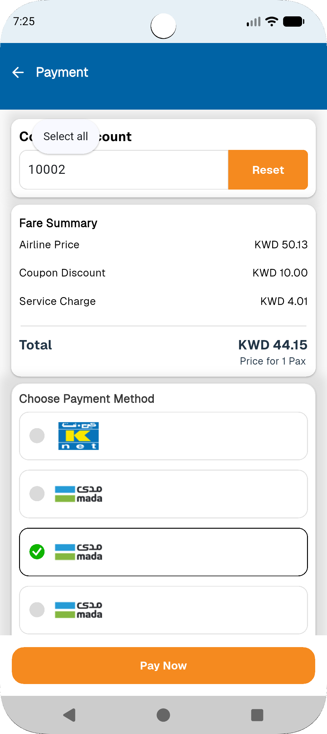 Today, I completed the payment screen for the flight module. Users can now view detailed fare information, apply or reset coupon codes and claim the discount, and select their preferred payment gateway to complete the transaction.