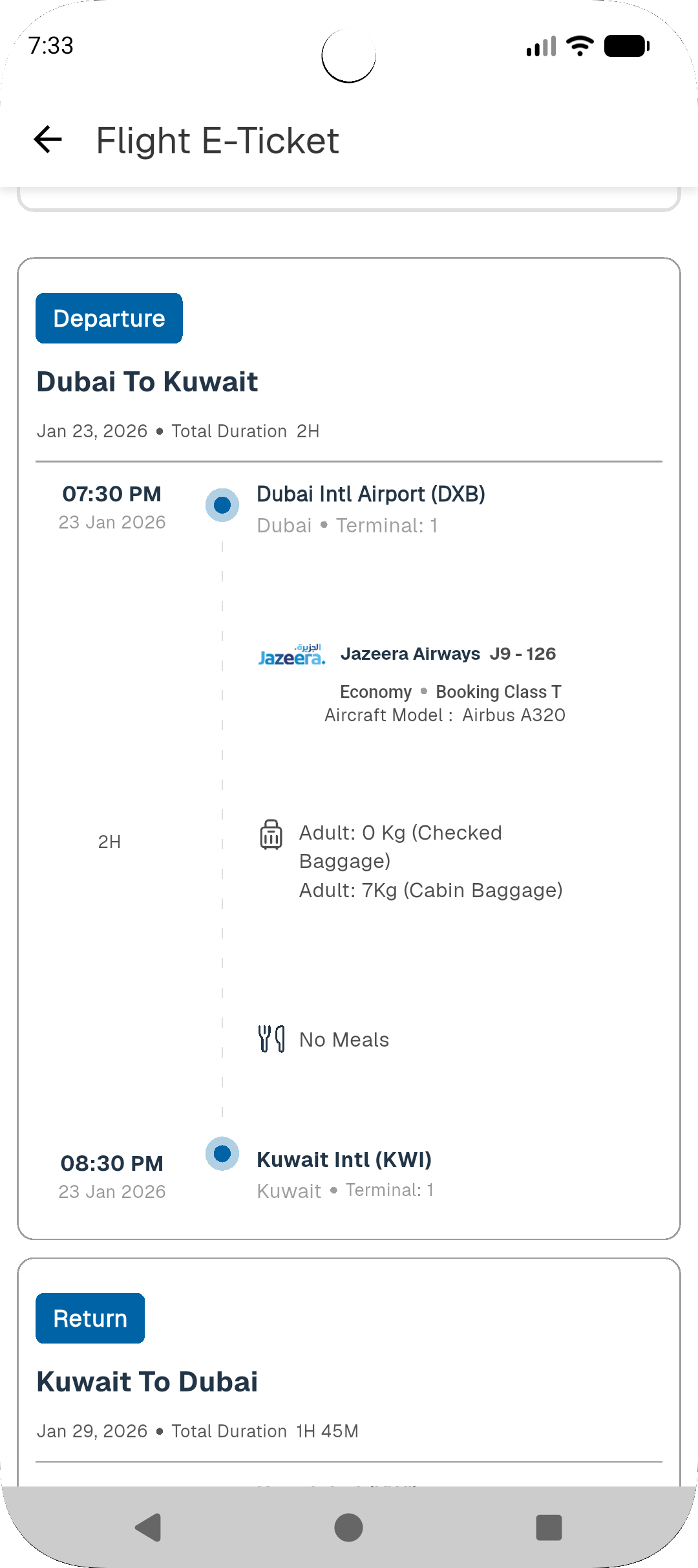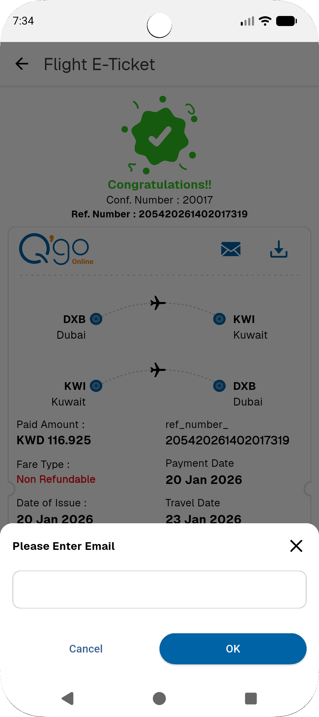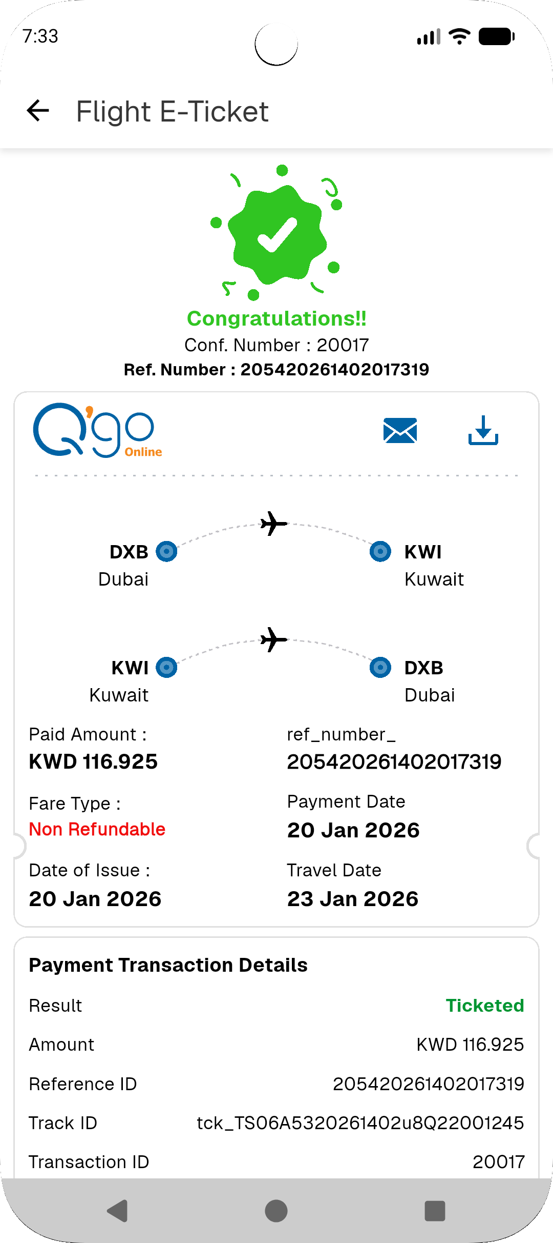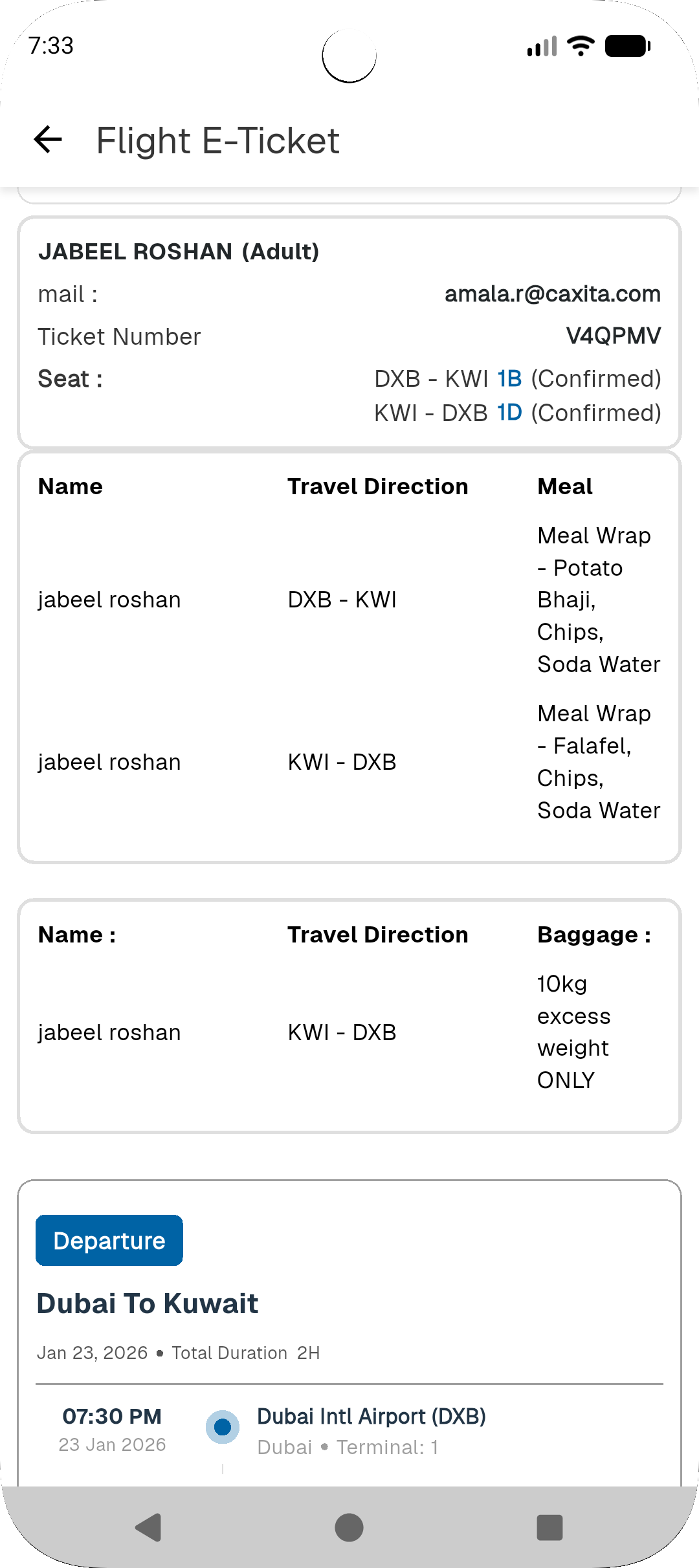 Today, I completed the ticket screen integration in the flight module. Users can now view travel details, fare details, ticket information, and payment transaction details. Additionally, if users have selected paid options such as baggage, meals, or paid seats, these are also displayed for each traveler. The screen allows users to email their ticket, as well as download it directly to their device. Once the download is complete, the ticket file is stored on the device and opens automatically.