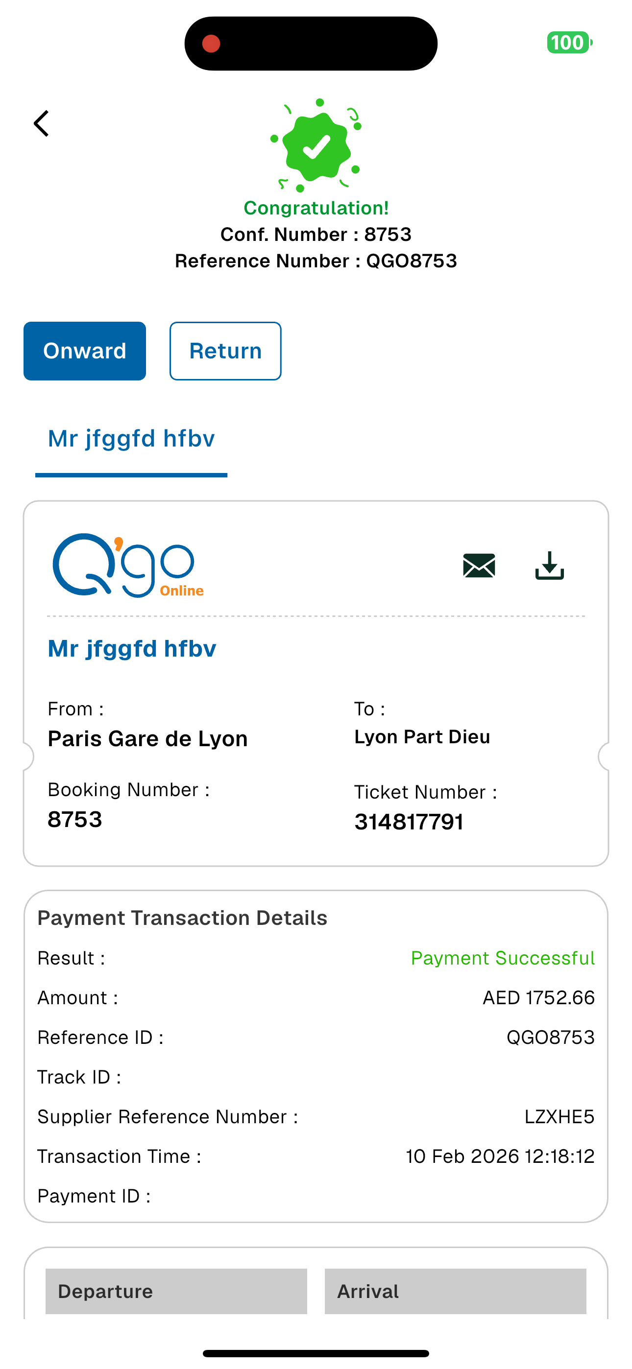 The MPGS payment gateway integration for the Train module has been partially completed. The API-side integration is still pending, so the app-side integration is currently on hold, This case already communicate to Api team. The normal booking flow has been successfully ticketed. Screenshot attached. When the user is logged in, the [GetPax] response is not being received in the staging and 100
