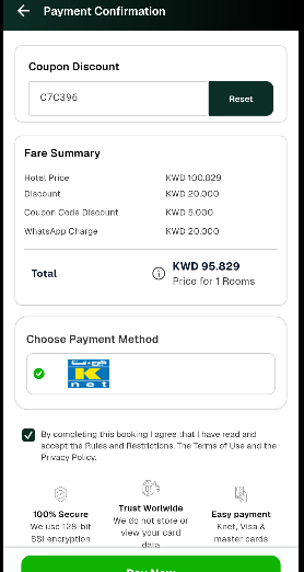 Searched a hotel, In the result page the amount is shown with the discount applied amount selected a room and proceeded up to payment gateway selection page. Then tried to apply a coupon code "C7C396" of 5 Amount, in fare summary the amount displayed is the total amount after discount. Please show the amount as per split up that is (hotel price/Discount amount / coupon code price/ service charge and WhatsApp charge separately in Fare summary). which could be more convenient for the user. And the amount shown in the fare summary is wrong but passing correctly to PG page and voucher. Please find the attached screen shot for reference.
